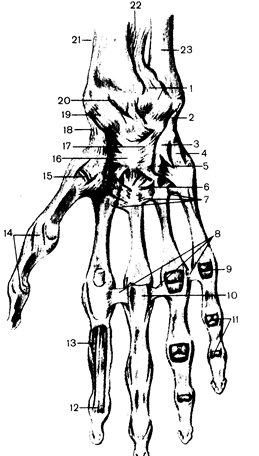 1 - art. radioulnaris distalis; 2 - lig. collaterale carpi ulnare; 3 - lig. pisohamatum; 4 - lig. pisometacarpale; 5 -hamulus ossis hamati; 6 - ligg. carpometacarpalia palmaria; 7—ligg. metacarpalia palmaria; 8 - ligg. metacarpalia transversa profunda; 9 - art. metacarpophalangealis (вскрыт); 10 - vagina fibrosa digitorum manus (вскрыта); 11 - art. interphalangeales (вскрыты); 12 - te ndom. flexoris digitorum profundi; 13 -tendo m. flexoris digitorum superficialis; 14 - ligg. collateralia; 15 - art. carpometacarpalis pollicis; 16 - os capitatum; 17 - lig. carpi radiatum; 18 - lig. collaterale carpi radiale; 19 - lig. radiocarpale palmare; 20 - os lunatum; 21 - radius; 22 - membrana interossea antebrachii; 23 — ulna. К межзапястному суставу относится также и сустав междугороховидной и трехгранной костями — сустав гороховидной ко c ти ,articulatio ossis pisiformis, подкрепленный горохови д но-крючковой связкой,lig. pisohamatum, и горохвидно-пястной связкой,lig. pisometacarpale, которая заканчивается на основании IV—V пястных костей. Суставная капсула тонкая, особенно сзади, прикрепляется по краям суставных поверхностей сочленяющихся костей. С лу чевой стороны суставная капсула подкрепляется лучевой коллатеральной связкой запястья,lig. collaterale carpi radiat e, идущей от шиловидног о отростка лучевой кости к ладьевидной кости (рис. 6). Расположенная с локтевой стороны локтевая коллатеральная связка,lig. collaterale carpi ulnare, натянута между шиловидным отростком локтевой кости с одной стороны, трехгранной и гороховидной костями - с другой. На ладонной и тыльной поверхностях лучезапястного сустава находятся соответственно ладонная и тыльная лучезапястные связки. Ладонная луче запястная связка,lig. radiocarpale palmare, начинается от переднего края суставной поверхности лучевой кости, прикрепляется отдельными пучками к костям первого ряда запястья и к головчатой кости второго (дистального) ряда. Тыльная лучезапяст н ая связка, lig. radiocarpale dorsale, идет от лучевой кости исключительно к первому ряду костей запя стья. Среднезапястный сустав, articulatio mediocarpalis. Он распо ложен между костями первого и второго рядов запястья и функционально связан с лучезапястным суставом. Сочленяющиеся поверхности этого сустава имеют сложную конфигурацию. Таким образом, в суставе имеется как бы две головки, одна из которых образована ладьевидной костью, а вторая - головчатой и крючковидной костями. Первая сочленяется с костью трапецией и трапециевидной костью, вторая с трехгранной, полулунной и ладьевидной костями. Суставная капсула среднезапястного сустава относительно свободная и очень тонкая с тыльной стороны. Полость среднезапястного сустава продолжается между костями, образующими первый и второй ряды запястья, т. е. соединяется с полостями межзапястных суставов. Межзапястные суставы, articulationes intercarpales. Эти суставы расположены между отдельными костями запястья. Образованы они обращенными друг к другу поверхностями сочленяющихся костей. Среднезапястный и межзапястные суставы укреплены ладон ными и тыльными связками. На ладонной поверхности расположена лучистая связка запястья,lig. carpi radiatum, представляющая собой пучки волокон, расходящиеся от головчатой кости к рядом расположенным костям. Здесь находятся также ладонные межзапястные связки,ligg. intercarpalia palmaria, а на тыльной - тыльные межзапястные связки,ligg. intercarpalia dorsalia. Они идут от одной кости к другой, преимущественно в поперечном направлении. Отдельные кости запястья соединены между собой также внутрисуставными связками. Это межкостные межзапястные связ ки,ligg. intercarpalia interossea представляют собой продолжение сухожилия локтевого сгибателя кисти. Запястно-пястные сус
