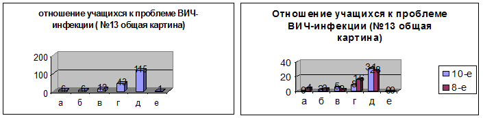 Из 147 человек 8(6%) с беспорядочной половой жизнью. Один из них с нестандартной сексуальной ориентацией. Для этой группы(с беспорядочной половой жизнью) не имеет смысла рассматривать вопросы о друзьях, т.к. половой партнёр в этом случае может быть как знакомым человеком, так и незнакомым. Однако шестеро из восьми не гуляют с друзьями, следовательно они или ответили несерьёзно, или не задумывались над этим вопросом. Что же касается сексуального образования, то всего два человека из восьми говорили с родителями о сексе, о проблеме ВИЧ-инфекции в этой группе разговоры были у трёх человек. Это говорит о том, что родители не только не уделяют данным проблемам нужное количество времени, но и не знают о своих детях некоторые факты, причиной этого является малое количество времени уделяемого ребёнку. Этот вывод справедлив как для лиц с беспорядочной половой жизнью, так и для лиц с нестандартной сексуальной ориентацией, т.к. из последних о СПИДе с родителями разговаривал лишь один человек, причём из троих с нестандартной сексуальной ориентацией. Это говорит о том, что родители не справляются со своими обязанностями и дети остаются на произвол судьбы. Диаграмма8Диаграмма9 Диаграммы 8 и 9 нам показывают, что 10-классники имеют гораздо больше друзей, имеющих вредные привычки, по сравнению с 8-классниками, в то время как лиц с вредными привычками наоборот, больше в восьмых классах. Отсюда можно сделать вывод, что ученики 8-х классов более подвержены вредному влиянию, в то время как 10-классники уже поменяли свой круг интересов, что подтверждают две пары верхних столбиков в диаграммах 8 и 9. Отношение к проблеме СПИДа