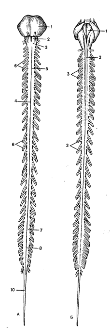 Рис 1. Спинной мозг. А, В - вид спереди: 1 - мост; 2- продолговатый мозг; 3 - перекрест пирамид; 4 -передняя срединная щель; 5 -шейное утолщение; 6-передние корешки спинномозговых нервов; 7 - пояснично-крестцовое утолщение; 8 -мозговой конус; 9 - конский хвост; 10 - терминальная нить. Б - вид сзади: 1 - ромбовидная ямка; 2 - задняя срединная борозда; 3 - задние корешки спинномозговых нервов. На всем протяжении с каждой стороны от спинного мозга отходит 31 пара передних и задних корешков, которые , сливаясь, образуют 31 пару правых и левых спинномозговых нервов . каждому сегменту спинного мозга соответствует определенный участок тела, получающий иннервацию от данного сегмента. В шейном и поясничных отделах спинного мозга обнаруживается шейное и пояснично-крестцовое утолщения, появление которых объясняется тем, что эти отделы обеспечивают иннервацию соответственно верхних и нижних конечностей. Начиная с 4-го месяца развития плода, спинной мозг отстает от роста позвоночника. В связи с этим происходит изменение направления следования корешков. У взрослого человека корешки краниальных сегментов еще сохраняют горизонтальный ход; в грудном и верхнем поясничных отделах корешки следуют косо - вниз и латерально; в нижнем поясничном и крестцово-копчиковых отделах корешки, направляясь к соответствующим межпозвоночным поясничным и крестцовым отверстиям, располагаются в позвоночном канале почти вертикально. Совокупность передних и задних корешков нижних поясничных и крестцовокопчиковых нервов окружает терминальную нить наподобие конского хвоста . Вдоль всей передней поверхности спинного мозга в срединной щели , а в доль задней поверхности - задняя срединная борозда . Они служат границами, разделяющими спинной мозг на две симметричные половины. На передней поверхности, несколько латеральнее срединной борозды, тянутся две передние латеральные борозды - сюда выходят из спинного мозга справа и слева передние корешки. На задней поверхности имеются задние латеральные борозды - места проникновения с обеих сторон в спинной мозг задних корешков. В спинном мозге выделяют серое и белое вещество. БЕЛОЕ ВЕЩЕСТВО ПОЛУШАРИЙ. Все пространство между серым веществом мозговой коры и базальными ядрами занято белым веществом. Белое вещество полушарий образовано нервными волокнами, связывающими кору одной извилины с корой других извилин своего и противоположного полушарий, а также с нижележащими образованиями. Топографичеки в белом веществе различают четыре части, нерезко отграниченные друг от друга: 1) белое вещество в извилинах между бороздами; 2) область белого вещества в наружных частях полушария - полуовальный центр (centrum semiovale); 3) лучистый венец (corona radiata), образованный лучеобразно расходящимися волокнами, входящими во внутреннюю капсулу (capsula interna) и покидающими ее; 4) центральное вещество мозолистого тела (corpus callosum), внутренней капсулы и длинные ассоциативные волокна. Нервные волокна белого вещества делят на ассоциативные, комиссуральные и проекционные. Ассоциативные волокна связывают между собой различные участки коры одного и того же полушария. Они разделяются на короткие и длинные. Короткие волокна связывают между собой соседние извилины в форме дугообразных пучков. Длинные ассоциативные волокна соединяют более отдаленные друг от друга участки коры. К