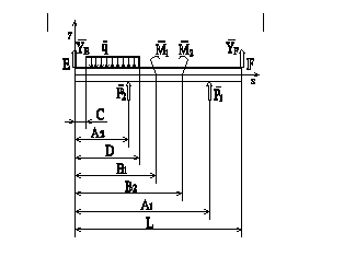 Знаки величин принимаются относительно направлений, обозначенных на рисунке. 1.1 Найти: YE-? ZE-? YF-? ZF-? Решение: Заменим опоры в точках E и F их реакциями. Таким образом несвободное тело EF становится свободным, и к нему можно применить условия равновесия. Для поперечных сил положительным принято направление по оси y ; положительным моментом - момент, сжимающий верхние волокна балки. Для расчета реакций опор распределенную нагрузку q заменим равнодействующей R, приложенной в середине отрезка CD действия нагрузки q, в точке с координатой (C+D)/2. R = q•Dl; Dl = в – С. Условия равновесия тела EF : еQyn = 0 : сумма поперечных сил еQzn = 0 : сумма продольных сил еMn = 0 : сумма изгибающих моментов Силы P1, P2, R приложены перпендикулярно к оси z, поэтому их проекции на эту ось будут нулевыми по величине, еQzn = 0. Уравнение суммы поперечных сил : YE – q • (D – С) + P2 + P1 + YF = 0 Уравнение суммы изгибающих моментов относительно точки E : – (D – С) • q • (С +D) / 2 + P2 • A2 – M1 + M2 + P1 • A1 + YF • L = 0 Знаки в уравнениях определены исходя из направлений, обозначенных на эквивалентной схеме нагрузки балки (рис.3), поэтому в уравнениях используются модули нагрузочных величин (ЅP1Ѕ,ЅP2Ѕ,ЅRЅ,ЅM1Ѕ,ЅM2Ѕ) и обозначаются без векторной черты. Возможные отрицательные значения искомых величин YE и YF будут означать противоположное их направление выбранному на схеме. Из уравнения моментов вычисляем силу YF : YF = [(D – C) • q • (С +D) / 2 – P2 • A2 + M1 – M2 – P1 • A1] / L YF = [(1,2–0,2)•20•(1,2+0,2)/2–10,0•1,0+16–11–8,0•2,5] / 3,1 » –3,6 Из уравнения поперечных сил вычисляем силу YE : YE = q • (D – С) – P2 – P1 – YF YE » 20 • (1,2 – 0,2) – 10,0 – 8,0 – (–3,6) = 5,6 [кН]. Для проверки составим уравнение моментов относительно другой точки. Знаки в уравнении определены исходя из эквивалентной схемы балки (рис.4), где искомые реакции опор YE и YF имеют правильные направления. Уравнение суммы изгибающих моментов относительно точки F : –(D–С)•q• [(L–D)+(L–C)]/2+YE•L+P2•(L–A2)+P1•(L–A1)+M1–M2=0 Обращение левой части уравнения в нуль при подстановке данных и найденных величин подтверждает правильность значений найденных реакций опор YE и YF. –(1,2–0,2)•20•[(3,1–1,2)+(3,1–0,2)]/2+YE•3,1+10,0•(3,1–1,0)+ +8,0•(3,1–2,5)+16–11 = 0; –17,2+5,6•3,1 » 0. 1.2 Найдем зависимость внутренних усилий (поперечных сил Q и изгибающих моментов M) на протяжении балки от координаты z, начиная от точки E (z - расстояние до точки E). Бесконечно близко1) слева (со стороны точки E) к точкам приложения сил и моментов проведем сечения. Таким образом, на протяжении балки образуются 7 участков. Рассмотрим, начиная от точки E, изменение внутренних напряжений (Q и M) балки на каждом участке в зависимости от координаты z. zn - расстояния от точки E до точек приложения нагрузок, z0 = 0. Пусть Q(z) - функция зависимости внутренней поперечной силы (балки) от координаты z; 0 Ј z < z7.