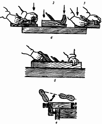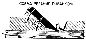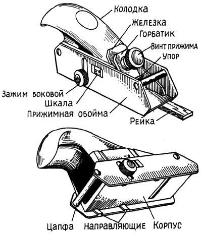 Приемы строгания: В начале строгания на инструмент нажимают левой рукой, к середине усилия обеих рук выравнивают, а к концу надавливают правой рукой, чтобы не «завалить» конец детали. Строгают спокойно, не спеша, но уверенно, в полный размах, с равномерной подачей инструмента на всех участках. Корпус работающего должен быть слегка наклонен вперед, левая нога выдвинута вперед, а правая — находиться под углом 70° по отношению к левой. Качество строгания проверяют линейкой «на просвет», оно во многом зависит от степени подготовки инструмента. Лезвие железки рубанка должно выступать из плоскости подошвы на толщину снимаемой стружки. Сначала устанавливают лезвие железки, а затем регулируют его углы. При правильной установке лезвия стружка должна быть одинаковой толщины на всех ее участках. Шерхебель - небольшой узкий рубанок с полукруглой формой режущей кромки железки. Он служит для первоначальной обдирки или снятия большого припуска с заготовок. После обработки шерхебелем получается неровная, бугристая поверхность. Углы заострения и установки резца те же, что и для рубанка. Рубанок состоит из металлической или деревянной колодки и резца, так называемой железки. В металлических рубанках резец закрепляется регулируемым винтом, в деревянных - клином.