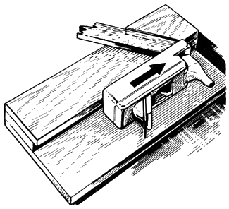 Примером использования донца может служить обработка края фанерного шпангоута летающей модели. Шпангоут кладут на донце таким образом, чтобы обрабатываемая сторона немного выступала за край накладки, левой рукой плотно прижимают шпангоут к упорной накладке. Рубанок держат правой рукой на боку и строгают вдоль накладки. При работе следят за тем, чтобы не сострагивать направляющую накладку. Со временем она все же изнашивается и край обрабатываемой на донце детали получается непрямолинейный. Тогда направляющую накладку надо проверить угольником и восстановить правильность ее кромки. Протяжка - приспособление для строгания и калибровки тонких реек и т. п. Она представляет собой доску с рядом желобков, имеющих глубины, равные часто употребляемым сечениям реек. Для удобства в работе протяжку зажимают в тиски столярного верстака или привинчивают к рабочему столу. Рейки, изготовленные на пиле с припуском 0,5 мм на сторону, кладут в подходящий желобок и, держа левой рукой рубанок, правой рукой вытягивают рейку на себя. Протянув рейку 2-3 раза, проверяют ее сечение и переходят к обработке другой стороны рейки. 2. Механический способ. Строгание электрическим рубанком в значительной мере облегчает этот процесс. Но чистота обработки поверхности часто не отвечает необходимым требованиям. Поэтому окончательную доработку изделия нужно выполнять обычным фуганком. При строгании электрорубанком следует обращать внимание на толщину снимаемой стружки. Ножи под плоскостью подошвы электрорубанка должны выступать так, чтобы обеспечить сначала снятие чернового слоя (поверхность при этом выравнивается), а затем слоя с выровненной поверхностью. При работе с электрическим рубанком очень важно правильно наладить строгальный механизм. Лезвия ножей должны находиться на одном уровне с задней панелью (лыжей). На ножевом валу не должно быть биения, а лезвия располагают параллельно оси барабана. В процессе работы электрорубанок двигают по древесине прямо, без перекосов, следя за тем, чтобы на ножи и панель не попадали пыль, стружка и опилки. Все дефекты ножей (загибы, выкрошенные места, плохая заточка и т.д.) будут отражаться на поверхности древесины. Поэтому, чем лучше подготовлен к работе инструмент, тем меньше в последующем будет ручной доработки. Электрофуганок состоит из раздвижной колодки, мотора и ножевого вала. Материал подается навстречу вращающемуся ножу с одновременным нажимом. Чтобы предотвратить несчастные случаи, подавать следует деревянной колодкой или толкателем. Качество строгания зависит главным образом от правильности заточки и установки ножей в барабане. Необходимо следить, чтобы ножи были выставлены над поверхностью стола строго одинаково и параллельно плите стола. От сильной вибрации фуганка при работе может ослабнуть затяжка болтов, закрепляющих ножи, поэтому болты необходимо периодически подтягивать гаечным ключом до отказа.