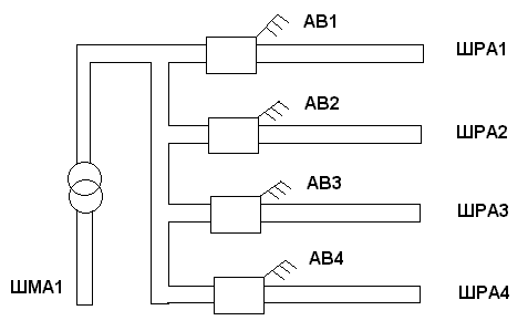 где П - предохранитель , Р - трех фазный рубильник Выбираем мощность трансформатора (приложение 12) Sтр ³S'макс Sтр = 295.06 [кВА] Sном.тр. = Sмакс / b Sном.тр. = 295.06 / 0.75 = 393.41 [кВА] Sном.тр. = 393.41 [кВА] Возьмем один трансформатор типа ТС3-400 80х50 ; ШРА4-630-32 IУ3 2.6. Расчет заземления Определяем число электродов заземления подстанции 604 [кВ] на стороне с напряжением 6 [кВ] Нейтраль изолирована на стороне 0.4 [кВ] , наглухо заземлена .Заземление общей протяженностью воздушной линии lвл=0 км , кабельной линии lкаб=5 км 4 y2 = 1.5 , Ãизм.= 0.6 × 10 [Ом] Решение : Ток однофазного заземления на землю в сети 6 [кВт] Iз = U ( 35 lкаб + lв) / 350 где U - напряжение питающей сети lкаб - длина кабеля lв - длина воздушной линии Сопротивление заземляющего устройства для сети 6 [кВт] R = Uз / Iз где Uз - заземляющее напряжение Iз - ток однофазного заземления на землю Rз = 125 /3 = 41.7 [Ом] Rз = 41.7 [Ом] Сопротивление заземления для сети 0.4 [кВт] с глухо заземленной нейтралью должно быть не более 4 [Ом] Расчетное удельное сопротивление группы равняется гр = y2×Ãизм. 4 3 Ãгр = 1.5 × 0.6× 10 = 9 × 10 [Ом × м] 3 Ãгр = 9 × 10 [Ом × м] Выбираем в качестве заземлителей прутковое заземление длиной l = 5м Сопротивление одиночного пруткового электрода равно Rо.пр. = 0.00227 × 9000 = 20.43 [Ом] Rо.пр. = 20.43 [Ом] Применяемые заземлители размещаются в ряд с расстоянием между ними а=6м Коэффициент экранирования h=0.8 при а>1 , R=4 [Ом] n = Rо.пр. / hRэ где Rо.пр. - сопротивление одиночного пруткового электрода Rэ - сопротивление взятое из правил установки электро оборудования n = 20.43 / 0.8 × 4 = 6.38 , округляем в большую сторону n = 7 [шт] Заземление включает в себя семь прутков. 2.7. Расчет токов короткого замыкания от источников питания с неограниченной энергии При расчете токов короткого замыкания важно правильно составить расчетную схему , т.е. определить что находиться между точкой короткого замыкания и источником питающим место короткого замыкания , а для этого необходимо рассчитать токи короткого замыкания . Предположим , что подстанция подключена к энергосистеме мощностью S = ¥ , питающее режимное сопротивление системы Хо = 0 Uн=10 кВт