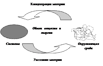 Рис. 1. Схема самодвижения материи в комплексе «система- окружающая среда». Необходимо отметить, что между двумя основными типами систем – активными и пассивными – нет резкой, непреодолимой границы, а наоборот, существует диалектическая взаимосвязь. Так, при определенных условиях в некоторых пассивных системах может возникать механизм самодвижения материи. Например, если вспомнить проблему происхождения жизни, то окажется, что активный материальный обмен в коацерватных каплях закономерно возник на определенном этапе эволюции из неживой природы, то есть, при определенных условиях активные структуры образовывались из соответствующих пассивных структур. И наоборот, активные системы при определенных условиях могут прекращать материальный обмен со средой и превращаться в пассивные системы. Например, во многих случаях гибели живых организмов не за счет внутренних процессов, а под действием внешних факторов, их основные структуры некоторое время еще сохраняются, а материальный обмен в них прекращается и структура становится необратимо пассивной. Кроме того, в некоторых случаях может наблюдаться естественный диалектический взаимопереход структур из активного состояния в пассивное и наоборот. Так, например, микроорганизмы и многие простейшие одноклеточные при неблагоприятных условиях образуют цисту, в которой материальный обмен со средой практически прекращается и о ней можно говорить как о пассивной системе на определенном отрезке времени. В таком пассивном состоянии система может существовать длительное время, но при наступлении благоприятных условий в ней вновь начинается материальный обмен. 2.3. Общие закономерности взаимодействия активных систем с окружающей средой. Бытует представление, что живые системы (прежде всего живые организмы) и социальные системы (человек, коллектив, государство и т.д.) обладают исключительным свойством: они являются открытыми системами и, в связи с этим, растут, развиваются и размножаются. Считается, что существует коренное отличие живого от неживого, систем живой и неживой природы. На основе полученных результатов, живое и социальное не обладают исключительностью по сравнению с неживой природой (космической материей), системы которой также в соответствующих условиях растут, развиваются (усложняются элементарные частицы, атомы, молекулы), зрелые материнские системы размножаются (самораспадаются атомы радиоактивных элементов, молекулы распадаются на ионы, самораспадаются звезды и галактики при взрывах). А при самораспаде в ряде случаев образуются не мертвые осколки, а активные радикалы, дающие в процессе эволюции начало новым соответствующим активным системам (дочерним системам); затем вновь развивающимся и «дающим потомство». Отличие состоит в том, что активные космические системы в этом аспекте гораздо менее изучены в связи с рядом объективных и субъективных причин. Таким образом, не только биотической и социальной, но и космической материи присущи активные системы, в которых осуществляется процесс самодвижения материи. Следовательно, наличие активных систем органически присуще как космической, так биотической и социальной материи. Это универсальное свойство любой формы материи, проявляющейся на различных структурных уровнях, универсальное свойство в целом всей ма