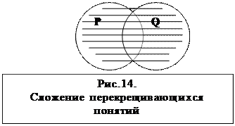 С теоретической точки зрения сопоставление классов P +Q и Р• Q представляет интерес для изучения двух существенно разнящихся способов соединения некоторых произвольных множеств в новое (сложное) множество. Практический аспект проблемы имеет непосредственное отношение к выбору союзов и других средств организации текста, при помощи которых несколько исходных смысловых единиц объединяются друг с другом, образуя новое понятие. Пользуясь символическим языком, то есть, применяя логические постоянные « + » и « • », мы легко улавливаем и точно фиксируем различие между сложением и умножением понятий. В естественном речевом общении (в неформализованных текстах) объединение понятий не всегда дает достаточно ясную картину. Объясняется это следующими обстоятельствами. Во-первых, рассмотренные операции не исчерпывают всех возможных способов связи исходных понятий. Во-вторых, и это главное, любые операции, включая сложение и умножение, могут выражаться различными средствами естественной речевой коммуникации. В логике договариваются читать выражение P + Q как Р или Q , а выражение Р• Q - как Р и Q , рассматривая союзы «или», «и» в качестве наиболее удачных словесных эквивалентов соответствующих операций. Однако в действительности нередко используются и другие средства выражения этих операций, в чем мы имели возможность убедиться на примере словосочетаний типа «студент-спортсмен», «журналист-международник» и т. п., где логическое умножение представлено дефисом. Что касается союзов «или» и «и», то нужно отметить их многозначность, способную в известных ситуациях создавать достаточно неопределенное представление о характере связи между некоторыми исходными понятиями. Удачна ли, например, следующая формулировка одного из правил пользования городским транспортом: «Безбилетный проезд и бесплатный провоз багажа наказываются штрафом»? Представим себе два подмножества, которые могут быть выделены во множестве пассажиров-нарушителей. В одно из них войдут пассажиры, не взявшие билета, в другое - не оплатившие провоз багажа. Если союз «и» рассматривать, как показатель логического умножения, то придется признать, что штраф должен быть наложен только на тех пассажиров, которые совершили сразу два проступка (но не какой-то один из них). Разумеется, житейский смысл ситуации, предусмотренной данным правилом, настолько ясен, что всякие разночтения этой формулировки, вероятно, были бы признаны казуистикой, но все же использование союза «или» здесь следует признать предпочтительным. Аналогичный характер носит следующая фраза: «Атеросклероз чаще всего поражает жителей больших городов и людей умственного труда». Исходные понятия «житель большого города» и «человек умственного труда» находятся в отношении перекрещивания. Вследствие недостаточной определенности их объединения в сложное понятие (оно выделено курсивом) возможны два варианта прочтения (истолкования, понимания) фразы: 1) атеросклероз чаще всего поражает жителей больших городов, занимающихся умственным трудом (логическое умножение: см. рис.18); 2) атеросклероз чаще всего поражает вообще жителей больших городов или вообще людей умственного труда (логическое сложение; см. рис.14). Поскольку второй вариант представляется более удачным для выражения данной мысли, и здесь также, вероятн