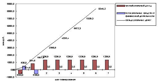 шаге ( При осуществлении проекта выделяется три вида деятельности: инвестиционная (1); операционная (2) и финансовая (3). В рамках каждого вида деятельности приток Пi(t) и отток Оi(t) денежных средств. Обозначим разность между ними Фi(t): Фi(t)=Пi(t)-Oi(t) , (10) Где i= 1;2;3 – вид деятельности по шагам. Потоком реальных денег Ф(t) называется разность между Притоком и оттоком денежных средств от инвестиционной и операционной деятельности в каждом периоде осуществления проекта (на каждом шаге расчета). Ф(t) = [ П1(t) – О1(t)] + [ П2(t) – О2(t)] = Ф1(t) + Ф2(t) , (11) Сальдо реальных денег b(t) называется разность между притоком и оттоком денежных средств от всех трёх видов деятельности( также на каждом шаге расчёта): B(t) =[ П1(t) – О1(t)] = Ф1(t) + Ф2(t) + Ф3(t) , (12) Необходимым критерием принятия инвестиционного проекта является положительное сальдо накопленных реальных денег в любом временном интервале. 5.3. Оценка эффективности инвестиционного проекта Оценка предстоящих затрат и результатов при определении эффективности инвестиционного проекта осуществлялась в пределах заданного расчетного периода – горизонта расчета. Горизонт расчета измеряется количеством шагов расчета и составляет восемь шагов с шагом расчета один год. Для приведения разновременных затрат, результатов и эффектов к базисному моменту времени затрат (момент окончания первого шага расчета) используется коэффициент дисконтирования аt , определяемый для нормы дисконта Е=37% годовых. Основные составляющие потока реальных денег при осуществлении проекта приведены в таблицах 5.6. – 5.10. Расчет показателей эффективности дает следующие результаты: 1. Чистый реальный доход = 8346,2; 2. Индекс доходный реальный = 5,40 3. Срок окупаемости = 2 шага. 4. Чистый дисконтированный доход = 2332,4 5. Срок окупаемости дисконтированный = 2 шага. 6. Внутренняя норма доходности дисконтированная = 192,25% Графическое отображение результатов оценки эффективности инвестиционного проекта представлены на рисунке 5.1. Графическое отображение осуществлении инвестиционного проекта представлено на рисунке 5.2. Таким образом, произведенный расчет показал, что проект эффективен, ЧДД положителен, ИД превосходит единицу, ВНД и срок окупаемости имеют приемлемое для инвестора значение. Список литературы