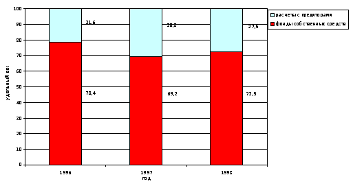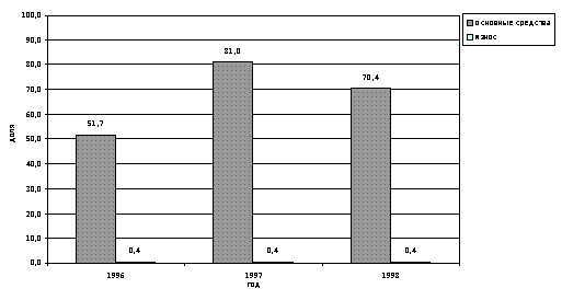 Финансовое положение предприятия в значительной степени зависит от целесообразности и правильности вложения финансовых ресурсов в активы. Активы динамичны по своей природе. В процессе функционирования предприятия и величина активов и их структура претерпевают постоянные изменения. Наибольшее представление об имевших место качественных изменениях в структуре средств и их источников , а так же динамики этих изменений можно получить с помощью вертикального и горизонтального анализа отчетности. Вертикальный анализ показывает структуру средств предприятия и их источников. Можно выделить две основные черты, обуславливающие необходимость и целесообразность проведения вертикального анализа : - переход к относительным показателям позволяет проводить сравнение экономического потенциала и результатов деятельности предприятий, различающихся по величине используемых ресурсов и других объемных показателей; - относительные показатели в определенной степени сглаживают негативное влияние информационных процессов, которые могут искажать абсолютные показатели финансовой отчетности и тем самым затруднять их сопоставление в динамике. В таблице 3.4, 3.5, 3.6 приведено структурное положение по укрупненной номенклатуре статей . Из приведенных данных видно, что снизился удельный вес основных средств на 7,4% в 1997 году по сравнению с 1996 годом, в 1998 году удельный вес возрос на 8,7% по сравнению с 1997 годом. Удельный вес запасов и затрат в 1997 году возрос на 4 % по сравнению с 1996 годом, в 1998 году сократился на 1,4% по сравнению с 1997 годом. Удельный вес дебиторской задолженности в 1997 году возрос на 3,3% по сравнению с 1996 годом, что говорит о неблагоприятной тенденции, в 1998 году удельный вес сократился на 7,1% по сравнению с 1997 годом, что говорит о положительной тенденции. Удельный вес денежных средств в 19997 году сократился на 0,12% по сравнению с 1996 годом, в 1998году продолжается сокращение. Удельный вес собственного капитала в 1997 году сократился на 9,2% по сравнению с 1996 годом, в 1998 году вырос на 3,3% по сравнению с 1997 годом. Прибыль отсутствовала в 1996,1997 и 1998 годах. Предприятие не пользуется ссудами банков – что достаточно распространено среди малых предприятий, предпочитающих избегать уплаты высоких процентов за пользование банковскими ссудами. Удельный вес расчетов с кредиторами в 1997 году возрос на 9,2% по сравнению с 1996 годом, в 1998 году снизился на 3,3% по сравнению с 1997 годом. Это говорит о неблагоприятной тенденции. Структура актива баланса показана на рисунке 3.1. Структура пассива баланса показана на рисунке 3.2 . 3.3 Вертикальный анализ баланса Таблица 3.4 Вертикальный анализ баланса ОАО «АТП № 9» за 1996г. проценты
