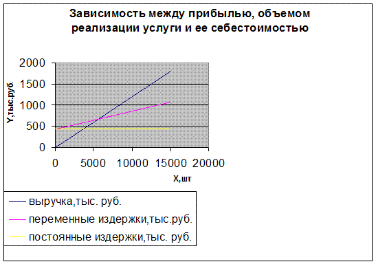 10 . Анализ безубыточности Размер прибылей и убытков зависит от уровня продаж. Для того чтобы знать, какой потребуется уровень продаж для достижения прибыльности предприятия, необходимо провести анализ безубыточности. Проведем анализ безубыточности по такому виду услуг, как печать текста. Будем использовать графический способ. Предполагаемый объем оказания услуг-15000 листов, по цене 120 руб. Объем оказания услуг равен объему продаж,т.е. 1800 тыс. руб. Постоянные затраты составляют 430,5 тыс.руб. Переменные расходы на единицу услуги – 41,8 руб., а на весь запланированный объем оказания услуг-627 тыс.руб. прибыль составит 742,5 тыс.руб. (1800-627-430,5)