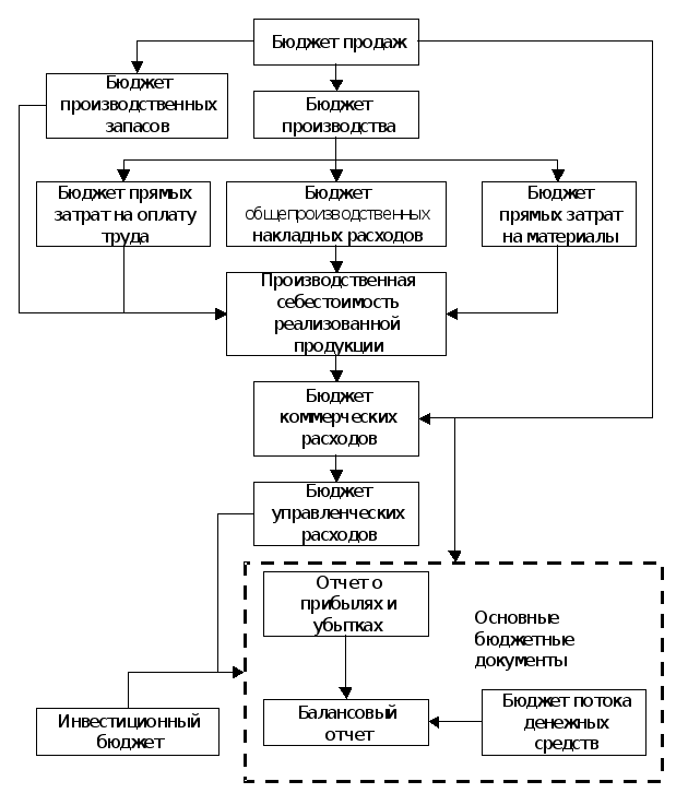 Бюджет - финансовый документ, отражающий серию спланированных событий, которые свершатся в будущем, т.е. прогноз будущих финансовых операций. Система бюджетов позволяет руководителю заранее оценить эффективность управленческих решений, оптимальным образом распределить ресурсы между подразделениями, наметить пути развития персонала и избежать кризисной ситуации. Наряду с понятием "разработка бюджетов на многих отечественных предприятиях используется термин "бюджетирование". Бюджеты могут быть составлены как для предприятия в целом, так и для его подразделений. Основной бюджет - это финансовое, количественно определенное выражение маркетинговых и производственных планов, необходимых для достижения поставленных целей1. Его зачастую называют генеральным, он охватывает производство, реализацию, распределение и финансирование. В основном бюджете в количественном выражении рассматриваются будущая прибыль, денежные потоки и поддерживающие планы. Основной бюджет представляет итог многочисленных обсуждений и решений о будущем предприятия, обеспечивает как оперативное, так и финансовое управление. Исходя из определений основных функций управления — планирование, мотивация, контроль — бюджетирование соединяет в единое целое управленческий цикл планирования и контроля. Бюджетный процесс используется для достижения двух основных целей - планирования и контроля. Планирование - это качественное и количественное описание задачи, проектирование возможных результатов и пути их достижения. Контроль - это действие, которое помогает выполнению проектируемых решений, и представление оценки, обеспечивающее обратную связь1. Для выполнения этих функций необходимо иметь данные бюджета и исполнительских отчетов. Отчет исполнителя — это изменение фактического состояния объекта. Он, как правило, состоит из сравнения бюджетных и фактических результатов. Расхождения бюджетных и фактических данных называются отклонениями. Отчет помогает управлять по отклонениям, что позволяет менеджерам на практике концентрировать усилия на процессах, заслуживающих внимания, а не на тех, которые исполняются без отклонений. Бюджетирование – это система согласованного управления подразделениями предприятия в условиях динамично развивающегося, диверсифицированного бизнеса. С его помощью принимаются управленческие решения, связанные с будущими событиями, на основе систематической обработки данных2. На современном промышленном предприятии задача бюджетирования состоит в повышении эффективности работы предприятия посредством:
