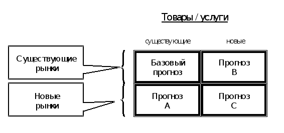 Руководитель предприятия утверждает бюджет продаж после рассмотрения представленных двух основных документов (Бюджет продаж, см. Приложение 1, табл.1, график ожидаемых поступлений денежных средств от продаж, Приложение 1, табл. 2) руководителями других структурных подразделений (производственного, материально – технического, финансового отделов и др.). Бюджет продаж составляется с учетом: уровня спроса на продукцию предприятия, географию сбыта, категории покупателей, сезонных факторов и прочих аналогичных факторов1 . При прогнозировании продаж в терминах «Товар/Рынок» рассматриваются 4 вида прогнозов (см. рис. 5.).