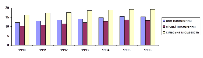 Як видно з таблиці, у 1996р. коефіцієнт народжуваності у міських поселеннях був приблизно на 21,5% менше, ніж у сільських, а коефіцієнт смертності – на 31,7%. У 1990р. коефіцієнти народжуваності сільського та міського населення були рівними, а коефіцієнт смертності міського населення був на 37% менше ніж коефіцієнт смертності сільського населення. Це вказує на те, що за період 1990-1996рр. Народжуваність зменшувалась у містах набагато швидше ніж у селах трохи повільніше ніж у селах, у той час як смертність зростала у селах трохи повільніше ніж у містах. Однією з важливих рис сучасної демографічної ситуації слід вважати зменшення коефіцієнта народжуваності в міських населених пунктах і меншою мірою в сільських , та збільшення додатньої різниці між рівнем народжуваності в селах та містах. Негативні тенденції у зміні рівнів народжуваності і смертності відповідно впливають на показники відтворення населення. Нетто-коефіцієнт відтворення населення, який характеризує заміну існуючого покоління наступним за умов існуючого рівня смертності і народжуваності у вікових групах населення, зменшився з 1990р. по 1995р. на 29,1%, зокрема, в міських поселеннях – на 32,2% і на 22,9% - в сільській місцевості. Депопуляція справляє значний вплив на вікову структуру населення. Кількість літніх осіб збільшується, натомість кількість дітей у віці до 15 років зменшується. За 1995-1996рр кількість осіб пенсійного віку зросла в 1,8 раза. Кількість пенсіонерів у розрахунку на кількість населення працездатного віку зросла з 0,48 у 1980р. до 0,76 у 1996р., тобто в 1,56 раза. Це означає, що дедалі менша кількість працівників і платників податків повинна буде утримувати дедалі зростаючу кількість пенсіонерів. Зменшенню абсолютної кількості трудових ресурсів у 90-х рр. (здебільшого внаслідок змін у віковій структурі населення) не сприяють тенденції розвитку ринку праці в Україні. Відбувається стрімке падіння рівня реальної заробітної плати, зростання безробіття і вимушеної неповної зайнятості населення. Абсолютна кількість трудових ресурсів за 1990-1996рр. зменшилась на 6,66%, зайнятість – 11,3%. У 1996р. кількість працівників, які знаходились у відпустках без збереження заробітної плати, становила 23,8% до загальної кількості робітників і службовців, що на 24,4% вище рівня 1995р., а працювали в режимі неповного робочого дня (тижня) 8,6% загальної кількості робітників і службовців, що на 42,3% загальної кількості робітників і службовців, що на 42,3% вище рівня 1995р. Негативні тенденції природного руху в Україні у 90-х рр. поєднуються із змінами якісних характеристик відтворення населення, що має прояв у падінні рівня особистого споживання товарів і послуг збільшенні питомої ваги витрат на харчування у структурі особистого споживання тощо. У 1996р. 57% доходів громадян України витрачалось на харчування. Про зростання бідності свідчать зміни у споживанні окремих продуктів харчування на душу населення. За період 1990-1996рр. споживання на душу населення м’яса і м’ясопродуктів в перерахунку на м’ясо зменшилося на 46,2%, молока і молочних продуктів – на 38,4, фруктів і ягід – на 21,9, яєць – на 40, олії – на 28,4, овочів і баштанних – на 16,1, риби – на 75,4, цукру – на 34%. Швидке погіршення соціально-економічних умов життя широких верств населення тягне за собою погіршення санітарно-гігієнічних умов і неадекватність усіх видів обслугову