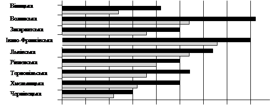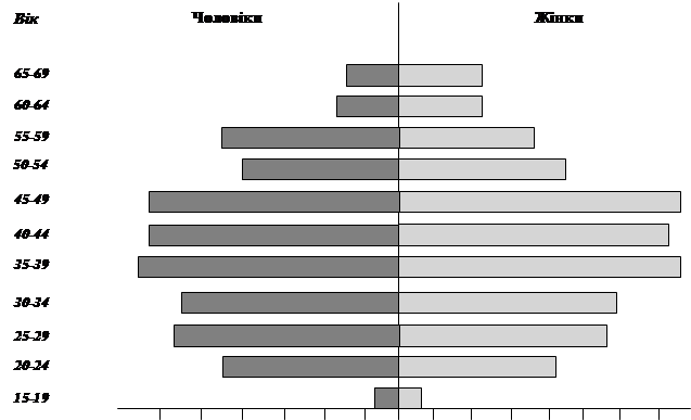 2. СКЛАД І СТАТЕВО-ВІКОВА СТРУКТУРА ТРУДОВИХ РЕСУРСІВ ЗАХІДНИХ ОБЛАСТЕЙ УКРАЇНИ Аналіз статево-вікової структури населення Західної України свідчить про перевагу жінок у загальній чисельності населення. Ця перевага характерна і для більшості вікових груп. Серед міських жителів перевищення кількості жінок над кількістю чоловіків має місце з 17-річного віку, а серед сільських лише після 42 років. Населення Західного регіону України належить до категорії старого. Причому вікова структура жінок старіша, ніж чоловіків, бо молодші вікові групи серед жінок складають меншу питому вагу, ніж серед чоловіків, а серед старших вікових груп жінок значно більше. Вважаючи, що активним агентом зайнятості є населення працездатного віку, є цікавим відстеження змін щодо регіональних співвідношень між віковими групами в регіонах. Ці пропорції в цілому по Україні в 1996р. становили: група молодша від працездатного віку до загальної чисельності населення становила 22,2%, частка населення працездатного віку – 55,6%, а старша від працездатного віку – 22,2%. За регіонами ці пропорції коливались відповідно від 19,8, 51,0, 29,2% у Чернігівській області до максимального рівня в м. Києві, де вони становили 21,4, 62,4 та 16,2%. Що стосується розбіжностей в областях за показником частки населення молодшого від працездатного віку в загальній кількості населення, то тут найбільший рівень припадав на Волинську (25,4%), Закарпатську (26,9%), Івано-Франківську (25,1%), Рівненську (26,2%) області. Це становище свідчить про особливе значення вирішення проблем, пов’язаних із забезпеченням соціального захисту підростаючого покоління та підготовки молоді до трудової діяльності. Регіональні розбіжності за таким показником, як частка населення, що старша за працездатний вік, становлять від згаданих 16,2% у м. Києві та 16,9% у Закарпатській, до 29,2% у Чернігівській областях. Приблизно в таких самих інтервалах, а саме понад 25% ця частка складає у Вінницькій – 26,5, Полтавській – 25,5, Сумській – 25,8, Хмельницькій – 25,2, Черкаській – 25,4%. Це дає підстави вважати, що в цих областях соціальна політика має враховувати ці демографічні особливості як у питаннях зайнятості людей похилого віку, але за станом здоров’я спроможних та бажаючих працювати, так і в питаннях соціального забезпечення. Повікова структура населення формує певну структуру трудових ресурсів, що можна прослідкувати на регіональному рівні. Регіональні пропорції в трудових ресурсах мають розбіжності, які відрізняють одну область від іншої у 5-8 і більше разів. Найбільші трудові ресурси зосереджені в Львівській області, частка яких у загальній кількості трудових ресурсів України становить понад 5%. Найменшу частку трудових ресурсів мають Житомирська, Волинська, Закарпатська, Івано-Франківська, Рівненська, Тернопільська та Чернівецька області. Частка кожної з них становить від 1,8 до 3% загальної чисельності трудових ресурсів. Серед областей з високим рівнем працюючих пенсіонерів та підлітків (понад 4% від загальної чисельності по Україні) – Вінницька та Хмельницька області. Найменша частка працюючих пенсіонерів та підлітків у Волинській області – до 1,1%. Регіональний розподіл населення, зайнятого в народному господарстві областей характеризується такими особливостями. Майже 11% загальної чисельності зайнятих у народному господарстві Україн