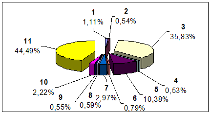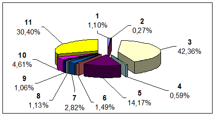 * - более наглядное изображение цифр можно посмотреть в Приложении на странице 23-24 Имея перед собой таблицу данных можно провести исследование процентного состава населения Волго-Вятского экономического района. В Волго-Вятском районе проживает 5.7% населения России, городское население района составляет 5.5% от России и приблизительно 4% от населения страны. Городское население составляет 70% Волго-Вятского района. В сельской местности проживает почти 30% всего населения района и почти 6.3% всего сельского населения России. Если же сравнивать сельское население района с городским то получится, что городское население превышает сельское более чем в два раза. Хотелось бы отметить преобладание городского населения над сельским. Что практически закономерно для всех экономических районов России. В период проведения экономических реформ все больше населения устремляется в города, где легче получить образование, найти работу и обеспечить свои семьи. Хотя с другой стороны показатель преобладания городского населения над сельским (более чем в 2 раза) не самый высокий по России (самый высокий в Северо-западном районе – более чем в 6 раз, а самый маленький в Северокавказском районе – менее чем в полтора раза). Такое положение дел можно было бы и отнести на счет появление новых технологий в сельском хозяйстве если бы не реальное положение дел в нашей деревне, где новую технику не видели уже несколько лет. Площадь района составляет почти 1.6% от общей площади Российской Федерации. Теперь проведем анализ населения отдельных составляющих района. Республика Марий Эл. Ее население составляет 9% от населения района и 0.5% от населения России. Доля городского населения составляет 8% городского населения района и 0.4% России. В республике доля населения составляет 11.4% от общего числа сельских жителей и примерно 0.7% России. Республика Марий Эл занимает 8.8% территории Волго-Вятского экономического района и 0.1% территории России. Республика Мордовия. Население этой республики составляет 11.3% от населения района, что на 1.3% больше, чем в республике Марий Эл. Процент жителей республики Мордовия по отношению к России составляет 0.6%. В городах проживает почти 59% населения республики, а в сельской местности 41%. Республика занимает 10% территории Волго-вятского района и 0.2% территории России. Чувашская республика. В этой республике проживает 0.9% населения Российской Федерации и 16.1% населения рассматриваемого района. Почти 61% населения проживает в городах, а в селах проживает около 39%. По занимаемой территории республика занимает последнее место среди составляющих Волго-вятского экономического района – 7% территории района и 0.1% территории России. Кировская область. По количеству проживающего населения область занимает второе место в районе – 19.4% населения района и 1.1% населения России. На долю городского населения приходится немногим более 70% населения области, что составляет 1% всего городского населения России и 19.4% городского населения района. В сельской местности проживает 1.2% сельского населения России и 19.1% селян района. Доля же сельского населения в области составляет немногим менее 30%. Кировская область занимает первое место в районе по занимаемой территории – 46%. Территория области занимает приблизительно 0.7% территории страны. Нижегородская область. На те