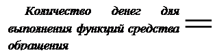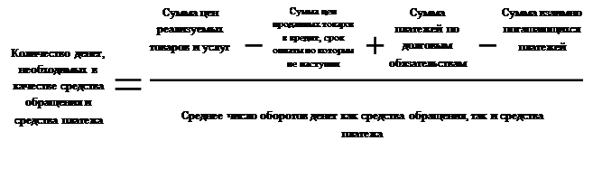 Скорость обращения денег определяется числом оборотов денежной единицы за известный период, так как одни и те же деньги в течение определенною периода постоянно переходят их рук к руки, обслуживая продажу товаров и оказание услуг. При функционировании золотых денег их количество поддерживалось на необходимом уровне стихийно, поскольку регулятором выступала функция сокровища. Эта функция устанавливала сравнительно правильное соотношение между денежной массой и товарами, необходимыми для обращения. Лишние деньги в обращении исключались, они уходили в сокровище. При росте товарной массы деньги возвращались из сокровищ. С появлением функции денег как средства платежа общее количество денег должно уменьшиться. Кредит оказывает обратное влияние на количество денег. Такое уменьшение вызывается погашением путем взаимного зачета определенной части долговых требований и обязательств. Количество денег для обращения и платежа определяется следующими условиями: общим объемом обращающихся товаров и услуг (зависимость прямая); уровнем товарных цен и тарифов на услуги (зависимость прямая, поскольку чем выше цены, тем больше требуется денег); степенью развития безналичных расчетов (связь обратная); скоростью обращения денег, в том числе кредитных денег (связь обратная). Таким образом, закон, определяющий количество денег в обращении, приобретает следующий вид.