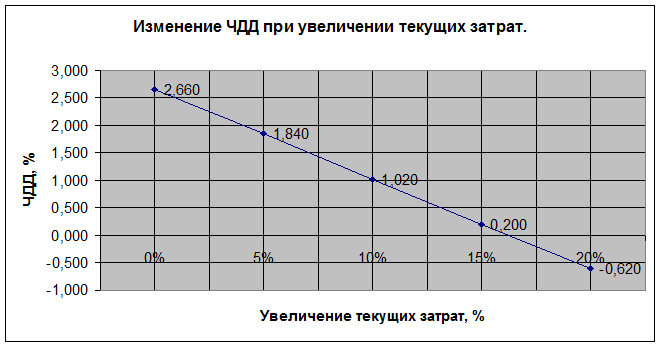 Аналогично можно оценить устойчивость проекта к изменению текущих затрат. Результаты расчетов приведены на рис.