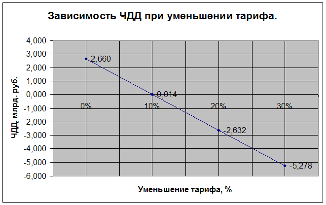 Из полученных данных следует, что уменьшение тарифа не должно быть более чем 10,05% (ЧДД = 0). Проект можно считать устойчивым к изменению тарифа, так как при тарифе =10% ЧДД =14 млн. руб.