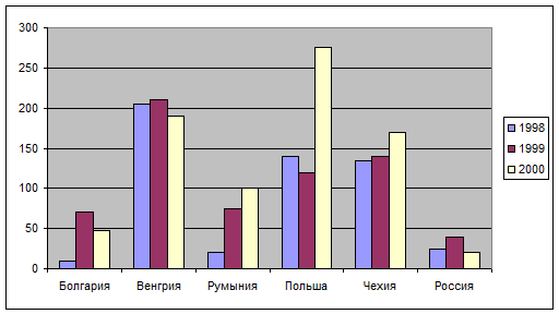 Неутешительным является и сравнение России с бывшими социалистическими государствами Центральной Европы. Уровень прямых иностранных инвестиций в 1998, 1999, 2000 гг. показан на рис. 3[12] . Рис. 3.
