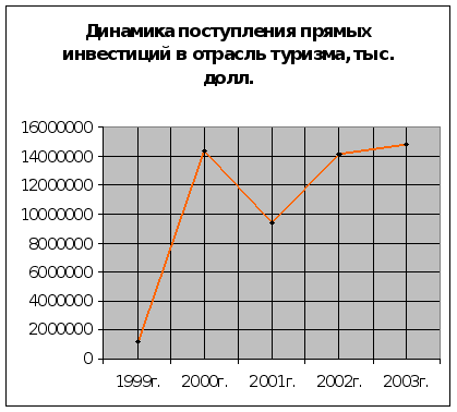 Исходя из того, что среднегодовая численность занятых в экономике составляет 1,8 мл. человек, доля занятых в сфере туризма составляет 0,37%. Данная цифра говорит о недостаточности человеческих ресурсов в туристской отрасли. Так, средняя величина этого показателя по всему миру составляет 2,8%, в Испании - 9%, в Австрии - 7%, во Франции и Греции - 6%, в США – 5%.27 Привлечение иностранных инвестиций и туристов стало важной стратегией развития туризма Кыргызстана. Это полностью оправдано тем фактом, что ежегодно количество отдыхающих иностранных туристов увеличивается на 15 - 30 %.28 По данным Комитета по туризму, спорту и молодежной политике КР в 2003 году всего в сферу туризма привлечено инвестиций на сумму 14.7 миллионов долларов США. Прямые иностранные инвестиции поступают как из стран СНГ, так и из стран вне СНГ. Согласно данным Национального статистического комитета КР в 2002 году из стран СНГ поступило 1,9 миллионов долларов США в виде прямых иностранных инвестиций, а из стран вне СНГ – 10,8 миллионов долларов США, что в совокупности составило 12,7 миллионов долларов США.29 Динамика поступления прямых иностранных инвестиций в сферу туризма Кыргызстана представлена в таблице 2.24. На основе данной таблицы построена наглядная диаграмма (Диаграмма 2.26). На диаграмме наблюдается тенденция увеличения поступления прямых иностранных инвестиций в сферу туризма Кыргызстана, несмотря на спад в 2001 году.