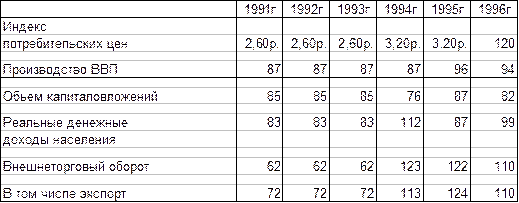 В качестве обобщающего показателя инфляции принято использовать индекс потребительских цен, динамика которого характеризует изменение уровня цен на самый крупный элемент использования ВВП – потребительские расходы домашних хозяйств, составляющие более половины его объема. В числе макроэкономических показателей приведены четыре: ВВП как показатель динамики общего объема производства товаров и услуг; капиталовложения за счет всех источников финансирования как индикатор инвестиционной активности; реальные денежные доходы населения как основной параметр изменения конечного потребительского спроса и уровня потребления населения с выделением показателя реальной заработной платы; внешнеторговый оборот как показатель объема внешнеэкономической деятельности. Это позволяет сравнить уровень инфляции с динамикой производства ВВП и трех основных элементов конечного спроса – реальных доходов населения, расходов на инвестиции и экспорта. Из таблицы вытекают следующие выводы. Пик инфляции приходится на начало реформ (1992г.), затем ее темпы замедлились и в настоящее время составляют менее 1% в месяц ( в 1992-1994гг. они измерялись двузначными числами). Снижение инфляции сопровождалось уменьшением спада производства. Так, на старте реформ производство ВВП сократилось в 1992г. на 19%, в 1993-1994гг. глубина спада находилась на уровне 12-13% и в 1995г. уменьшилось в 3 раза ( до 4%), но в 1996г. вновь увеличились. Гораздо слабее снижение инфляции воздействовало на торможение спада инвестиций, глубина которого в 2-3 раза больше сокращения общего уровня производства, в том числе и сегодня. Более существенным оказалось влияние снижения инфляции на стабилизацию покупательной способности и потребительского спроса населения. в целом за рассматриваемый период реальные денежные доходы населения сократились несколько меньше, чем общий уровень производства, что говорит об определенном перераспределении ресурсов на цели потребления, преимущественно для компенсации негативных социальных издержек реформ. В 1996г. замедление инфляции дополнилось стабилизацией размеров реальных денежных доходов населения. Быстрее всего ее снижение воздействовало на стабилизацию внешнеэкономической деятельностью. Сокращение внешнеторгового оборота со странами дальнего зарубежья приостановилось на втором году реформ. В течение трех последних лет объем торговли с этими странами в долларовом изменении увеличивается. В 1996г. обозначилось также расширение в долларовом эквиваленте торговли со странами СНГ. Маховик инфляции (инфляционная спираль) был во многом раскручен в результате применения необилеральной монета риской концепции реформ. Они были развернуты под очевидным влиянием, попытки применить, в России традиционную и в общем стандартную практику экономического либерализма, который придерживается в своей деятельности МВФ, Всемирный банк, правительства США, Англии и нескольких других западных государств. В основе этой практики лежит идея саморегулирования рынка и минимизации участия государства в управлении экономикой. Опыт других индустриального развития стран (ФРГ, Франции, Японии), где наряду с механизмом конкуренции широко используется система государственного регулирования рынка, был признан для российских условий менее подходящим. Объяснялось это в