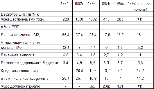 Данные таблицы 4 подтверждают совпадение тенденций инфляции спроса и предложения (издержек производства): их всплеск относится к 1992г., после чего происходит ее замедление в обеих сферах . Видно также более быстрое развитие инфляции спроса в начале реформ, последующие выравнивание роста цен на товары потребительского и производственного назначения и примерно с 1994г. – опережение роста цен на производственные ресурсы по отношению к потребительским ценам. В 1995г. индекс последних по отношению к 1991г. увеличилась в 1787 раз, тогда индекс цен производительностей на промышленную продукцию – в 2673 раза (опережение роста потребительских цен в 1,5 раза), индекс тарифов на грузовые перевозки – в 9339 раз. Современное состояние экономики России, как известно, характеризуется существенным снижением темпов роста цен, что выступает результатом жестокой правительственной финансовой и денежно-кредитной политики, направленной на ограничение роста денежной массы и спроса (с широким использованием и методов задержек выплаты заработной платы и пенсий), а также на противодействие “инфляции издержек” (путем прямого ограничения государством роста цен на продукцию естественных монополий, снижения реальной зарплаты); достигнута и стабилизация положения на валютном рынке. Но это – с одной стороны. С другой, продолжается спад производства и инвестиций, в худшую сторону меняется народнохозяйственная структура, нарастает технологическое отставание страны, снижается эффективность и углубляются диспропорции в производственной сфере. Достижение финансовой стабилизации затрудняется нарастанием убыточности предприятий, неисполнением доходной части федерального бюджета, обострением платежного кризиса. Нормальный денежный оборот этих условиях замещается “черным налом”, бартером, взаимозачетами, расчетами с помощью суррогатов денег (векселей, казначейских обязательств, налоговых освобождений и т.п.). Сложная ситуация складывается и в банковской системе в связи с ухудшением ликвидности большого количества коммерческих банков, с оскудением источников их прибыли из-за снижения инфляции, стабилизация валютного курса, падение процентных ставок и доходности операций с государственными ценными бумагами, растущего объема неплатежей в экономике. В этих условиях с исключительной остротой стоит проблема организации нормального взаимодействия денежного обращения и производственной сферы экономики, которое призвано обеспечить направление в необходимых объемах финансовых ресурсов на инвестиционные цели. К сожалению, механизм такого взаимодействия до основания демонтирован политикой ликвидации инфляционного разрыва между спросом и предложением преимущественно монетаристскими методами ограничения денежной массы и спроса. Чрезмерное усердие в этом направлении привело к нехватке в стране ликвидных платежных средств, результаты которых известны: упомянутые усиления спада производства и роста неплатежей (в том числе в бюджет), распространение различных суррогатов денег (если так можно выразится,”неживых денег”). В ситуации, сложившейся в России в итоге длительного и беспрецедентного по масштабам сокращения производства, на первое место выдвигается задача стимулирования экономического роста, а значит, - соответствующего увеличения спрос