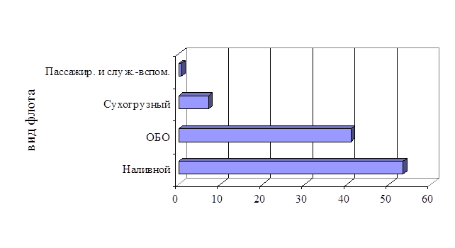 Из представленной таблицы следует, что в составе всего флота наибольший удельный вес –58,3% приходится на наливной флот, это говорит о том, что основную часть доходов пароходство получает от участия в перевозках на мировом рынке нефти и нефтепродуктов. Распределение тоннажа в процентах от суммарного дедвейта