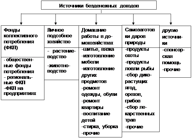 1.2. Безденежные доходы Наряду с индивидуальными доходами в денежной и натуральной форме население удовлетворяет широкий круг потребностей, пользуясь услугами социально-бытовой сферы. Существуют и другие варианты и источники безденежных доходов населения (рис.1). Доходы, получаемые в виде бесплатных или частично оплачиваемых льгот, бесплатных услуг, потребляемых населением за счет общественных или целевых фондов, являютсяиммобильной частью совокупного дохода. Они также определяют уровень доходов, способствуют росту уровня жизни, но являются строго целевыми и не могут быть заменены суммой денег, эквивалентной стоимости этих услуг и льгот. Другие источники безденежных доходов — это личное подсобное хозяйство, домашние работы и т.п.