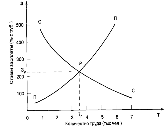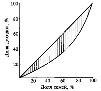 Рис. 2. Кривая Лоренца (1,с.532) дохода. Это значит, что если 20, 40, 60% семей получают соответственно 20, 40, 60% от всего дохода, то соответствующие точки будут расположены на биссектрисе. Кривая Лоренца демонстрирует фактическое распределение дохода. Например, 20% населения с самыми низкими доходами получили 5% общего дохода, 40% с низкими доходами — 15% и т. д. Заштрихованная область между линией абсолютного равенства и кривой Лоренца указывает на степень неравенства доходов: чем больше эта область, тем больше степень неравенства доходов. Если бы фактическое распределение доходов было абсолютно равным, то кривая Лоренца и биссектриса совпали бы. Кривую Лоренца можно использовать для сравнения распределения доходов в различные периоды времени или между различными группами населения. Одним из наиболее часто употребляемых показателей дифференциации доходов является децильный коэффициент, выражающий соотношение между средними доходами10% наиболее высокооплачиваемых граждан и средними наименее обеспеченных. Для характеристики распределения совокупного дохода между группами населения применяется индекс концентрации доходов населения (коэффициент Джини). Чем больше этот коэффициент, тем сильнее неравенство, т. е. чем выше степень поляризации общества по уровню доходов, тем коэффициент Джини ближе к 1. При выравнивании доходов в обществе этот показатель стремится к нулю. Для переходной экономики России первой половины 90-х гг. был характерен рост показателей дифференциации доходов. Децильный коэффициент вырос с 5, 4 в конце 1991 г. до 13, 3 в середине 1996 г. Коэффициент Джини повысился с 0, 256 в 1991 г. до 0, 351 в 1995 г. В идеале дифференциация общего уровня доходов сопровождается различиями в уровне оплаты труда в отдельных отраслях и сферах деятельности. В рыночной экономике отраслевая и межпрофессиональная дифференциация уровней оплаты труда отражает общественную полезность тех или иных занятий, служит ориентиром занятости, подготовки и переподготовки кадров. В России при переходе к рыночной экономике отмена ограничений на уровень оплаты труда привела к углублению межотраслевых различий. При довольно низком уровне средней заработной платы в национальной экономике в целом (120— 150 долл.) сложилась высокая ее дифференциация по отраслям, предприятиям и категориям работников. Так, в газовой, нефтедобывающей промышленности, электроэнергетике и цветной металлургии высокий уровень оплаты труда в значительной мер определяется монопольным положением предприятий, спросом на их продукцию на внутреннем и внешнем рынках. Наивысший уровень оплаты труда в российской экономике достиг в кредитовании, финансах и страховании. 2. Заработная плата В настоящее время заработная плата составляет наибольшую часть дохода работника. В развитой рыночной экономике заработная плата — это цена, выплачиваемая работнику за использование его труда, величина которой определяется рынком труда, т.е. спросом на рабочую силу и ее предложением. Чем больше спрос на конкретную рабочую силу и чем меньше ее предложение, тем выше заработная плата, и, наоборот, чем выше е е предложение, тем ниже заработная плата. Известны несколько рыночных моделей формирования конкретных ставок заработной платы, но это предмет экономической теории. Закономерность взаимодействия спроса и пред