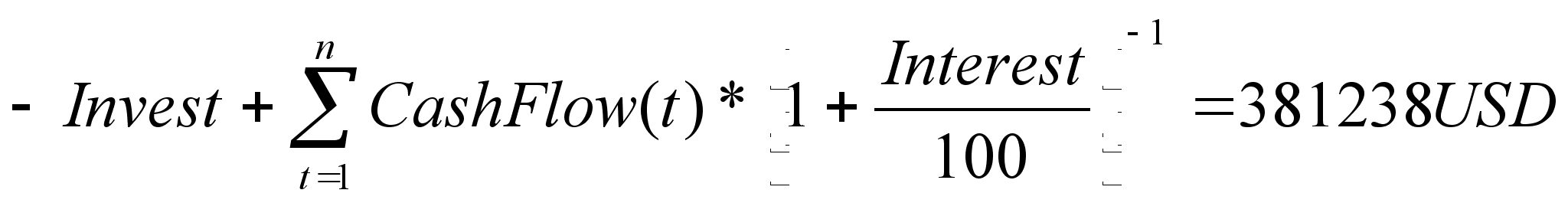 Внутренняя норма доходности определяется как дисконтированный множитель, приводящий разновременные значения баланса к началу реализации проекта. Она является минимальной величиной процентной ставки, при которой занятые средства окупятся за жизненный цикл проекта и должна быть не менее процентной ставки по кредиту. Для данного проекта внутренняя норма доходности (IRR) равна 33,3% (ставка кредитования 30%).