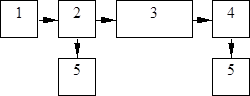 Рис. Схема системы для оптической передачи информации: 1 - источник света; 2 - модулятор света; 3 - линия передач; 4 - фотоприемник; 5 - сигнал. При использовании полупроводниковых лазеров в качестве источников света внешний модулятор может быть исключен (напосредственная модуляция лазера с помощью возбуждающего тока в этом случае имеет преимущество). Задача оптической передачи информации является передача излучения от передатчика к приемнику, и тем самым решающее значение приобретает среда распространения сигнала. Свойства среды в основном определяют конструкцию и размеры всей системы передачи, включая выбор источника света и приемника. Лазеры нашли широкое применение, и в частности используются в промышленности для различных видов обработки материалов: металлов, бетона, стекла, тканей, кожи и т. п. Лазерные технологические процессы можно условно разделить на два вида. Первый из них использует возможность чрезвычайно тонкой фокусировки лазерного луча и точного дозирования энергии как в импульсном, так и в непрерывном режиме. В таких технологических процессах применяют лазеры сравнительно невысокой средней мощности: это газовые лазеры импульсно-периодического действия, лазеры на кристаллах иттрий-алюминиевого граната с примесью неодима. С помощью последних были разработаны технология сверления тонких отверстий (диаметром 1 - 10 мкм и глубиной до 10 -100 мкм) в рубиновых и алмазных камнях для часовой промышленности и технология изготовления фильеров для протяжки тонкой проволоки. Основная область применения маломощных импульсных лазеров связана с резкой и сваркой миниатюрных деталей в микроэлектронике и электровакуумной промышленности, с маркировкой миниатюрных деталей, автоматическим выжиганием цифр, букв, изображений для нужд полиграфической промышленности. Второй вид лазерной технологии основан на применении лазеров с большой средней мощностью: от 1 кВт и выше. Мощные лазеры используют в таких энергоемких технологических процессах, как резка и сварка толстых стальных листов, поверхностная закалка, наплавление и легирование крупногабаритных деталей, очистка зданий от поверхностей загрязнений, резка мрамора, гранита, раскрой тканей, кожи и других материалов. При лазерной сварке металлов достигается высокое качество шва и не требуется применение вакуумных камер, как при электроннолучевой сварке, а это очень важно в конвейрном производстве. Мощная лазерная технология нашла применение в машиностроении, автомобильной промышленности, промышленности строительных материалов. Она позволяет не только повысить качество обработки материалов, но и улучшить технико-экономические показатели производственных процессов. Так, скорость лазерной сварки стальных листов толщиной 14 мКм достигает 100 м\ч при расходе электроэнергии 10 кВт. ч. Основным примером работы полупроводниковых лазеров является магнитно-оптический накопитель(МО). МО накопитель построен на совмещении магнитного и оптического принципа хранения информации. Записывание информации производится при помощи луча лазера и магнитного поля, а считывание при помощи одного только лазера. Область применения МО дисков определяется его высокими характеристиками по надежности, объему и сменяемости. МО диск необходим для задач, требующих большого дискового объема,
