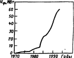 Широкое применение эффективных материалов, электронных устройств и параболо-цилиндрических концентраторов позволило построить СЭС с уменьшенной стоимостью - системы модульного типа. В качестве теплоносителя использовалась вода, а полученный пар подавался к турбинам. Первая СЭС, построенная в 1984 г., имела КПД 14,5%, а себестоимость производимой электроэнергии 29 центов/(кВт-ч). В период между 1984 и 1990 г. фирмой Луз было построено девять СЭС общей мощностью 354 МВт. Последние СЭС, построенные фирмой Луз, производят электроэнергию по 13 центов/(кВт-ч) с перспективой снижения до 10 центов/(кБт-ч). Д. Миле из университета Сиднея улучшил конструкцию солнечного концентратора, использовав слежение за Солнцем по двум осям и применив вакуумированный теплоприемник, получил КПД 25-30%. Стоимость получаемой электроэнергии составит 6 центов/(кВт-ч). Считают, что подобная система позволит снизить стоимость получаемой электроэнергии до 5,4 цента/(кВт-ч). При таких показателях строительство СЭС станет экономичным и конкурентоспособным по сравнению с ТЭС. Другим типом СЭС, получившим развитие, стали установки с двигателем Стирлинга, размещаемым в фокусе параболического зеркального концентратора. КПД таких установок "может достигать 29%. Предполагается использовать подобные СЭС небольшой мощности для электроснабжения автономных потребителей в отдаленных местностях. Мировой объем производства фотоэлектрических преобразователей с 6,5 МВт в 1980 г. увеличился до 29 МВт в 1987 г. и в 1993 г. составил более 60 МВт (рис.).