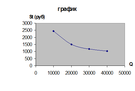 Где St - себестоимость продукции Q - объем выпуска продукции (исходные данные) n ед - переменные расходы, приходящиеся на единицу продукции St= Построим график изменения себестоимости продукции в зависимости от изменения объема выпуска продукции St= St= По графику изменения себестоимости видно, что при увеличении объема продукции себестоимость снижается, а при её снижении можно получить большую прибыль от реализации того же объема продукции.