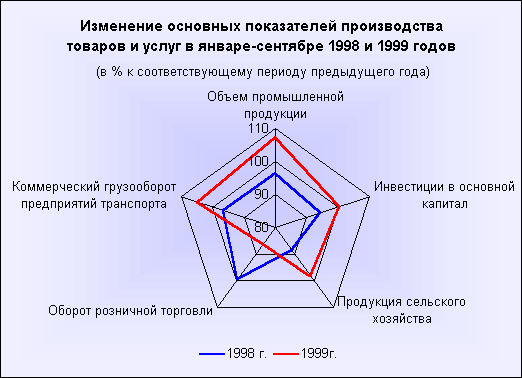 1) Оценка за I полугодие 1999г.; динамика за I полугодие к соответствующему периоду 2) предыдущего года. 2) Данные приведены за август 1999г., относительные показатели приведены в % за август и январь-август в текущих ценах. 3) К декабрю предыдущего года. Ниже приводится диаграммы (радары), характеризующие изменения основных показателей производства товаров и услуг в сентябре и январе-сентябре 1998 и 1999гг. (в % к соответствующему месяцу предыдущего года):