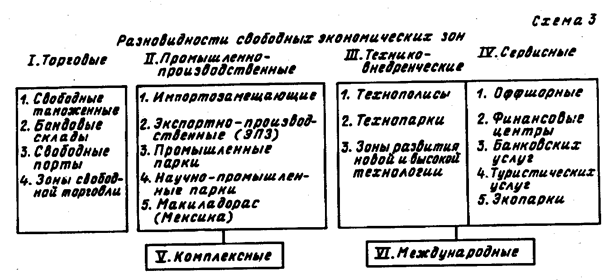 При организации свободных экономических зон используют два различных концептуальных подхода: территориальный и функциональный (точечный). В первом случае зона рассматривается как обособленная территория, где все предприятия-резиденты пользуются льготным режимом хозяйственной деятельности. Согласно второму подходу, зона — это льготный режим, применяемый к определенному виду предпринимательской деятельности независимо от местоположения соответствующей фирмы в стране. Примером реализации первого подхода являются свободные экономические зоны Китая, зона «Манаус» (Бразилия), многие экспортно-производственные зоны в развивающихся странах. Результатом второго подхода являются «точечные» зоны, представленные отдельными предприятиями (оффшорные фирмы, магазины «дьюти фри»). Одной из простейших форм свободных экономических зон являются свободные (беспошлинные) таможенные зоны (СТЗ). Эти зоны, как и свободные торговые зоны, относятся к зонам первого поколения. Они существуют с ХVII-XVIII вв. Эти зоны представляют собой транзитные или консигнационные склады для хранения, упаковки и незначительной обработки товаров, предназначенных для экспорта. Такие зоны часто называют бондовыми складами или свободными таможенными территориями. Свободные таможенные зоны освобождаются от таможенных пошлин на ввоз и вывоз товаров. Они имеются во многих странах. Зоны свободной торговли (ЗСТ) также широко распространены в мире. Наибольшее развитие зоны свободной торговли получили в США. Их создание предусмотрено специальным законом США от 1934 г., целью которого было поощрение торговли, ускорение торговых операций, сокращение торговых издержек. Такие зоны представляют собой ограниченные участки территории США, в пределах которых установлен льготный по сравнению с общим режим хозяйственной, в т. ч. внешнеэкономической деятельности. Законом было установлено, что при каждом официальном порте прибытия может быть создана, по крайней мере, одна внешнеторговая свободная зона. В соответствии с существующим законодательством США зоны свободной торговли, действующие на территории страны, подразделяются на зоны общего назначения и специализированные (субзоны). Зоны общего назначения занимают небольшое пространство (несколько кв. км) и находятся за пределами национальной таможенной территории. В них осуществляются операции по складированию и переработке ввезенных товаров (упаковка, сортировка, маркировка, доработка и т. п.). Субзоны создаются для отдельных крупных компаний, деятельность которых выходит за рамки зон общего назначения. В субзонах производится экспортная или импортозамещающая продукция. Субзоны являются результатом использования комбинации режимов зон свободной торговли и импортозамещающих производственных зон. К середине 90-х годов в США насчитывалось около 500 зон свободной торговли. К числу простейших зон свободной торговли можно отнести специальные магазины «дьюти фри» в крупных международных аэропортах. С точки зрения режима, они рассматриваются как находящиеся за пределами государственных границ. К зонам свободной торговли относятся также и традиционные свободные гавани (порты) со льготным торговым режимом. Промышленно-производственные зоны относятся к зонам второго поколения. Они возникли в результате эволюции 