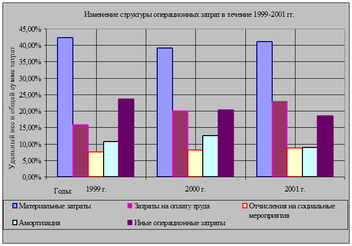 Как видно из таблицы, за три года значительно возрос спрос на огнеупорную глину и порошок основной глины. Для выявления степени влияния изменения объёмов производства и других факторов на расходы предприятия проведём следующий анализ: Анализ общей суммы операционных затрат .По данным формы № 2 “Отчёт о финансовых результатах”, приведенным в начале раздела ІІІ, структура расходов операционной деятельности за период 1999-2001 гг. по предприятию изменялась следующим образом. Динамика структуры операционных затрат