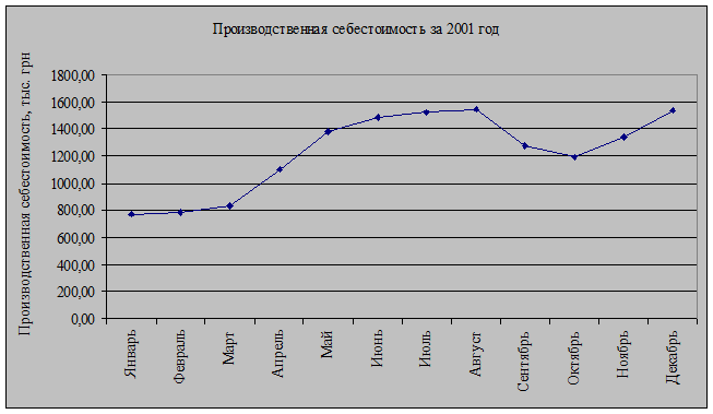 Более наглядно динамика изменения затрат приведена на графике ниже. Динамика изменения производственной себестоимости за 2001 год