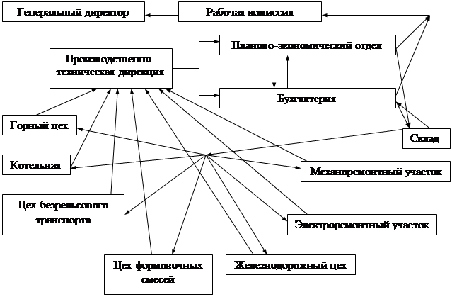 Перевозка полезного ископаемого из карьера осуществляется железнодорожным цехом. Полезное ископаемое из карьеров составами из 10-ти 60-тонных полувагонов тепловозами ТГМ-6 транспортируется до ст. Каолин. На ст. Каолин формируются составы из 16 полувагонов и отправляются на ст. Челюскин МПС. Перевозка вскрышных пород производится цехом безрельсового транспорта. Для перевозки вскрышных пород во внутренние отвалы используются автосамосвалы БелАЗ грузоподъёмностью 27 и 40 тонн. Электроэнергетический, ремонтно-механический участок и центральный склад осуществляют обслуживание всех подразделений. Так как рассматриваемое предприятие является закрытым акционерным обществом, то все наиболее важные решения рассматриваются и принимают на общем собрании акционеров, которое проходит раз в год в конце февраля – начале марта. Текущее управление обществом осуществляется советом правления. Структура управления акционерным обществом, принятая общим собранием акционеров от 6 марта 2001 года, приведена ниже:
