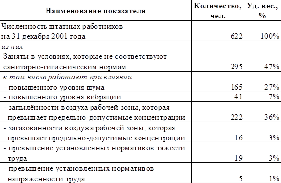 За 2001 год ЗАО “Минерал” потратило 508765 грн. на мероприятия по охране труда. При этом затраты на возмещение материального ущерба потерпевшим вследствие несчастных случаев составили 17810 грн. Основную часть этих затрат составило возмещение потерпевшим потерянного заработка. Анализ показывает, что эти затраты можно условно разделить на две категории: 1. Затраты, выплачиваемые потерпевшим вследствие несчастных случаев, которые произошли в анализируемом периоде. 2. Затраты, выплачиваемые потерпевшим вследствие несчастных случаев, которые произошли в периодах, предшествующих анализируемому. Часть из них (возмещения пенсий инвалидам) являются периодичными и уже не могут быть уменьшены путём повышения уровня охраны труда. Затрат по первой категории можно было бы избежать, своевременно определив причины их возникновения и приняв соответствующие меры. Тем самым можно было бы сэкономить 7435+55+2256 = 9746 грн., т.е. уменьшить данные затраты вдвое. 4. Инженерно-технические мероприятия по охране труда. 4.1.Мероприятия по производственной санитарии.В соответствии с формой 1-ПВ за 2001 год состояние условий труда на ЗАО “Минерал” следующее: