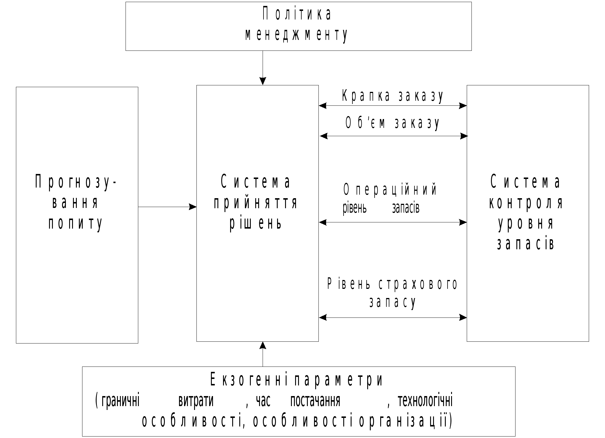 На обіг товарів впливає і безліч інших чинників: організація реклами і продажу товарів, транспортні умови, стан матеріально-технічної бази, особливості фасування товарів тощо. Важливе значення мають кваліфікація кадрів і рівень керівництва складним торговим процесом, організація праці і тощо. Оптимізація управління товарними запасами. В розвинених країнах управління товарними запасами базується на використанні потужних інформаційних технологій, що дозволяють практично щодня спостерігати їхній стан і динаміку, автоматично здійснювати розміщення замовлень через комп'ютерну мережу і поповнювати запаси до оптимального рівня. Найбільш розповсюджені системи управління запасами, що засновані на використанні моделі EOQ, засобу червоної лінії, двохсекторного засобу. В останній час отримав розповсюдження метод управління запасами по принципу Just-In-Time. При цьому повнота і вірогідність інформаційної бази забезпечується за рахунок автоматизації обліку і використання міжнародної системи кодування товарів. Загальний принцип, на якому засновані всі системи управління запасами - це взаємозв'язок вхідних і вихідних параметрів, що зазначені на схемі 1.