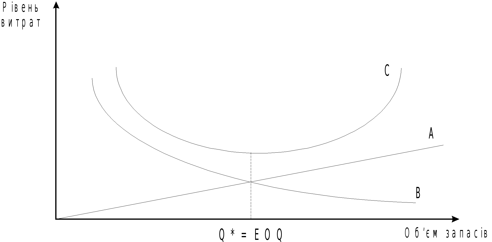 Відносно новим підходом до управління запасами, є принцип управління Just-In-Time ("просто вчасно"). Цей підхід вперше був використаний японськими корпораціями, а після цього знайшов розповсюдження в всьому мирі. Основна ідея полягає в тому, що запаси практичні не створюються, а процес доставки товарів постачальниками жорстко погоджений з технологічним процесом на підприємстві. В нинішній час такий підхід ефективно використовується компаніями Toyota, General Motors і багатьма іншими. Замовлення містяться з інтервалом 3-4 години і негайно реалізуються постачальниками. Ця система дозволяє отримати значний економічний ефект за рахунок доведення витрат зберігання до нуля. Однак, високий рівень вимог до точності функціонування системи постачань і ризик можливих помилок, що призведуть до порушенню технології, не дозволяє використати цей підхід в країнах з нерозвинутою інформаційною і комунікаційною інфраструктурою. Управління більшістю торговельних компаній розвинених країн засноване на використанні комп'ютерної технології. Системи управління включають автоматизовану систему обліку запасів і розміщення замовлень у постачальників. Рух кожної одиниці товарів, з допомогою магнітного штрихового кодування, відбивається в базі даних, що охоплює інформацію по всій торговій мережі компанії. Система управління базами даних дозволяє постійно оновлювати інформацію про стан запасів, при досягненні крапки замовлення, автоматичні розміщувати замовлення через комп'ютерну мережу і враховувати інформацію про поповнення запасів. При цьому, інформація про реалізацію товарів надходить в систему управління товарними запасами, дебіторською заборгованістю і грошовими засобами і обробляється на основі вбудованого в систему модельного інструментарію. Базова модель оптимального рівня запасів. Ідея використання базової моделі EOQ (Economic Ordering Quantity), тобто, моделі оптимального рівня запасів, полягає в визначенні такого рівня запасів, підтримання якого мінімізує сукупні витрати на управління ними. При цьому, сукупні витрати розбиваються на три однорідні групи: витрати зберігання, витрати, пов'язані з формуванням запасів і витрати, що виникають внаслідок недоліку товарних запасів. В таблиці 3 більш детально подана ця класифікація, а також вплив, який здійснює збільшення рівня запасів на поведінку витрат кожної групи. Зростання рівня запасів супроводжується збільшенням витрат зберігання в прямопропорційній залежності (пряма А на мал. 1), бо росте обсяг капіталу, іммобілізованого в запаси, складські витрати, витрати, пов'язані з старінням і псуванням товарів.