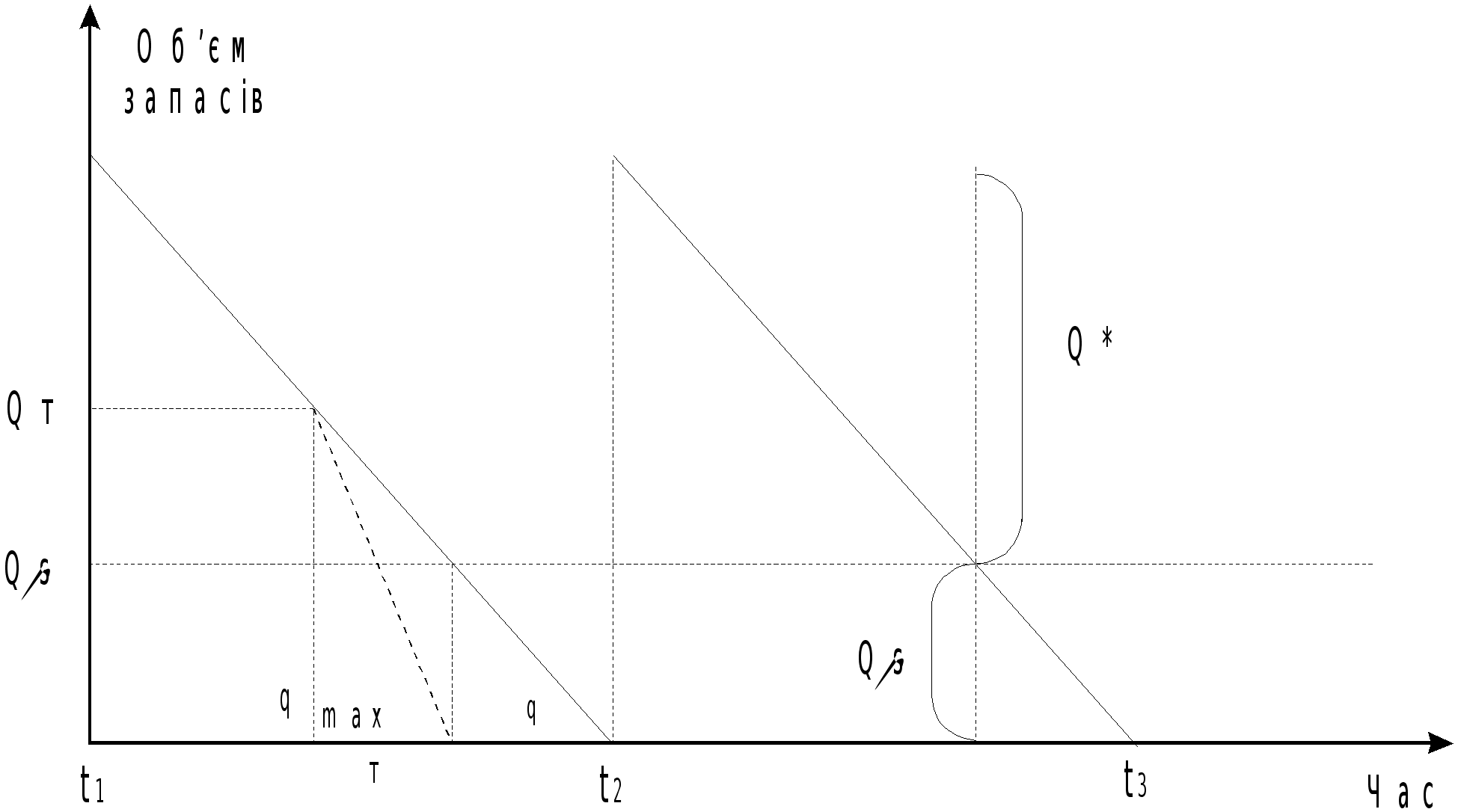 В рамках перерахованих допущень, процес формування і реалізації товарних запасів описується динамічною схемою, яка наведена на мал. 2. |