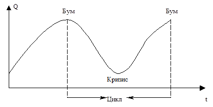 Рис.4. Графическое изображение цикла На данном графике крайние точки развития рыночной экономики характеризуют экономический бум и кризис. Подъем, экономики начинается с оживления фазы восстановления деловой активности в форме заключения новых хозяйственных договоров, постепенно и очень слабого увеличения спроса на рабочую силу, следовательно, сокращения безработицы, роста потребительского спроса. Затем начинается чистый рост, который характеризует постоянное, нарастающее увеличение объема производства товаров и услуг, высшая точка этого подъема характеризуется как бум . В это время в экономике наблюдается полная занятость, а производство работает на полную мощность. Реальный объём производства достигает в этой точке своего максимума. Цены, как правило, повышаются, а рост деловой активности, достигнув полной занятости ресурсов, прекращается и замирает. Кризис рыночной экономики характеризуется резким спадом производства, который начинается с постепенного сужения, сокращения деловой активности. Кризис отличается от нарушения равновесия между спросом и предложением на какой-то определенный товар или в отдельной отрасли хозяйства тем, что он возникает как всеобщее перепроизводство, сопровождаемое стремительным падением цен, банкротством банков, остановкой предприятий (фирм), ростом процента и безработицы. Постепенное сокращение деловой активности, замедление темпов роста в экономической литературе называется рецессией. Более высокие темпы сокращения экономической активности характеризуютспад рыночной экономики. Низшая точка этого спада есть кризис. Экономический кризис обнаруживает не только предел, но и импульс в развитии экономики, выполняя стимулирующую («очистительную») функцию. Во время кризиса возникают побудительные мотивы к сокращению издержек производства, увеличению прибыли, обновлению капитала на новой технической основе. С кризисом кончается предыдущий период развития и начинается следующей. Кризис — важнейший элемент механизма саморегулирования рыночной системы хозяйства. За спадом следует период депрессии (стагнация), который характеризуется застойным состоянием рыночной экономики, слабым спросом на потребительские товары и услуги, значительной нагрузкой предприятий, массовой безработицей, снижением уровня жизни населения. В этот период происходит приспособление хозяйства к новым условиям и потребностям экономики. Колебательная экономическая динамика наблюдается уже в течение более 170 лет, с тех пор, как капитализм стал «взрослым». Первый наиболее известный кризис разразился в Англии в 1821 г., потом кризисы наступили в Англии и США — в 1836 г., в США — в 1841 и 1847 гг.. Первым мировым кризисом считается кризис 1857 г., затем последовали кризисы 1873, 1882, 1890 гг. Наиболее сокрушительным был кризис 1900—1901 гг., который начался одновременно в США и России и обрушился прежде всего на металлургическую промышленность. Мировой кризис 1929—1933 гг. (в американской литературе его называют «Великая депрессия») по своей глубине превзошел все предыдущие и до сих пор остается одним из самых грандиозных, его последствия изучаются до сих пор. 28 октября 1929 г., вошедшим в историю мировой экономики как «черный понедельник», биржи Уолл- стрита объявили о катастрофическом падении курса ценных бумаг и начале «велик