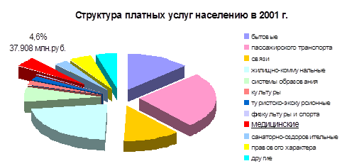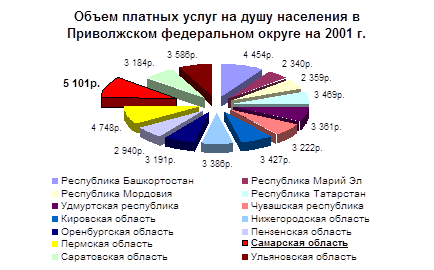 Рис. 2. Структура платных услуг населению в 2001 г. [26] В Приволжском федеральном округе Самарская область занимает первое место по объему предоставляемых платных услуг на душу населения. На конец 2001 г. он составил 5101 руб.![27] Это можно объяснить сильной разницей в регионах округа уровня жизни населения.