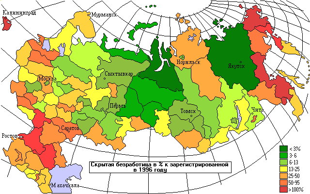 Группу наиболее проблемных с точки зрения официальной безработицы регионов образуют области и республики к востоку от Москвы - это и печально известные Владимирская, Ивановская и Кировская области, и республики Мордовия, Чувашия и Удмуртия. С добавлением менее динамично "развивающихся" Костромской и Ярославской областей этот ареал вырисовывается еще лучше. Кроме того, появляется второй ареал неблагополучия - на востоке Кавказа, включающий Калмыкию и Дагестан. При этом в различных регионах официально зарегистрированная безработица имеет разный генезис: если в старопромышленных областях центральной России она вызвана структурным кризисом (депрессией), то в Северо-Кавказских республиках - общей (хронической) трудоизбыточностью. Но, по-видимому, большее значение имеют другие факторы, среди которых выделяются эффективность работы местных служб занятости и срытая безработица. О важности последнего фактора говорит то, что в 1994 году около 4.8 млн. российских граждан числилось занятыми, хотя находилось в вынужденных неоплачиваемых отпусках или были заняты неполный рабочий день. В 1995 году их количество сократилось до 3.7 млн. Однако, за этот же период количество зарегистрированных безработных увеличилось почти на столько же. Но даже с этой поправкой уровень безработицы существенно отстает от уровня спада производства. То есть, в России имеет место весьма существенная скрытая безработица. Скрытая безработица. Характерной чертой безработицы в России в кризисный период является то, что она значительно ниже, чем можно было бы ожидать из уровня спада производства в стране. Отмеченное несоответствие безработицы и спада промышленного производства в России отчасти связано с существованием скрытого от официальной статистики производства. Но учет теневого сектора не объясняет всей разницы между большим спадом и существенно меньшим по величине приростом безработицы. На каждый процент прироста безработицы за 5 лет приходится в среднем почти вдвое больший спад реального производства продукции. Спад с 1991 по конец 1995 г. составил 35% при снижении занятости на 10%. Сопоставление этих процессов показывает, что в разных регионах России темпы этих двух процессов существенно различаются. Высокие значения этой разницы объективно соответствуют наличию фактически неработающего, но числящегося на предприятиях населения [2].
