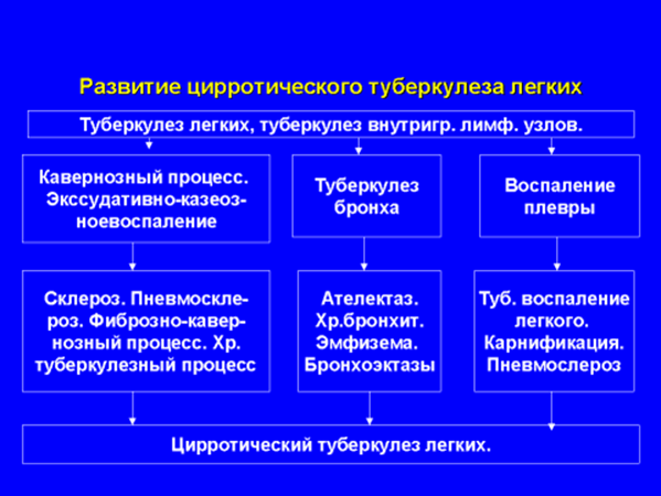 Цирроз легких — это разрастание в них соединительной ткани в результате заживления патологического процесса. В последние годы многие клиницисты подчеркивают, что массивное лечение антибиотиками способствует образованию цирроза. Цирроз развивается чаще всего при хронических фиброзно-кавернозных формах и при хроническом гематогенно-диссеминированном туберкулезе. Однако туберкулёзный лобит и плеврит также могут быть источником цирроза. В толще цирротических поражений могут сохраняться щелевидные или более крупные каверны, а также казеозные очаги, окруженные плотным валом склероза и скрытые под пластами цирроза. Hаличие таких остаточных явлений подтверждается бациллемией и послойными томограммами. При циррозе в процесс склерозирования и фиброзного перерождения вовлекаются бронхи, которые изменяют свои физиологические направления, деформируются, местами суживаются или облитерируются. Это придает циррозу некоторые характерные рентгенологические особенности. Цирроз может быть односторонним, двусторонним и диффузным. Легкое, поражаемое циррозом, постепенно уменьшается в объеме, плевра над ним утолщается. Легкое пронизано грубоволокнистой соединительной тканью, сосуды легкого частью облитерируются, частью расширяются. В пораженных участках могут образоваться буллы и бронхоэктазы. Meнее пораженные и здоровые участки легких эмфизематозно pacширяются. Классификация : · цирротический туберкулез с ограниченным поражением легочной ткани (как правило, верхние два сегмента, с деформацией, отсутствием каверны). Такие больные, как правило, хорошо себя чувствуют, ничего их не беспокоит. У таких больных годами, десятилетиями клинических проявлений рецидива нет. Такие больные эпидемически опасны, если они тем более находятся в семье. Но выделяют микобактерии в малом количестве. В ряде случаев эта форма, на фоне ОРЗ или стресса, начинает часто рецидивировать. · цирротический туберкулез с частыми рецидивами: больной начинает лихорадить (лихорадка, как правило субфебрильная), проявляется синдром интоксикации, который чаще всего проявляется тем, что больной теряет в весе. Больной быстро обезвоживается, худеет и процесс, в связи с частым рецидивированием начинает прогрессировать и фиброзная ткань захватывает половину легкого, целое легкое. Нередко поражается второе легкое, за счет бронхогенного обсеменения. Неизбежно, в обязательном порядке формируются бронхоэктазы. · цирротический туберкулез с бронхоэктазами. Эти больные тяжелы, порой обильные бактериовыделителей (за сутки могут выделить до 1 л мокроты). Больной истощается, высоко лихорадит. Такие больные крайне тяжелые. Бронхоэктазы обширные, вторично инфицируются и очень трудно поддаются лечению. В данном случае хирургические методы лечения применить нельзя (при пульпонэктомии одного легкого в другом легком развивается моментально туберкулез). Эти больные обречены. · цирротический туберкулез - разрушенное легкое (легкие). Это формируется в процессе длительного, постоянного прогрессирования процесса с развитием фиброзной ткани. При этом наблюдается легочно-сердечная недостаточность. Однако анасарки при такой сердечно-легочной недостаточности практически не наблюдается, так как эти больные постоянно лихорадят, а лихорадка всегда приводит к обезвоживанию. По