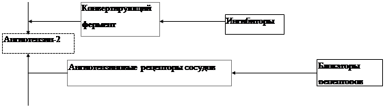 . Препараты уменьшающие активность ренина плазмы за счет уменьшения выработки ренина в почках - антиадренергические препараты ( особенно бета-блокаторы ). 2. Блокаторы конвертирующего фермента_. - наиболее мощные и перспективные. Каптоприл, Эналаприл, Рамиприл Механизм : 1. Уменьшение вазоконстрикции, обусловленной ангиотензином-2 2. Уменьшение секреции альдостерона - уменьшение задержки натрия и воды. 3. За счет центрального действия блокируют симпатомиметический эффект ангиотензина-2 4. Защищают кинины ( вазодилятаторы ) от разрушения. Показания : 1. Монотерапия АГ любой степени, но в основном умеренной, тяжелой, злокачественной. 2. Препятствуют гиперкальпии миокарда при хронической сердечной недостаточности. 3. Эффективны при диабетических ангиопатиях 4. Препятствуют развитию диабетической нефропатии, не допуская повышения АД в почках. Для купирования гипертонических кризов не применяются, так как выпускаются только в таблетках. Сравнительная характеристика препаратов : Каптоприл Применяется 4 раза в день - неудобно для длительного применения + большое количество побочных эффектов : Ортостатическая гипотензия, головная боль, головокружение, рефлекторная тахикардия ( попытка организма препятствовать снижению АД ). Эналаприл, Рамиприл а) в их составе нет атома серы - менее выражены побочные эффекты б) средства пролонгированного действия ( 1 - 2 ( в тяжелых случаях )) 3. Блокаторы ангиотензиновых рецепторов сосудов Саралазин - внутривенно, для снятия гипертонических кризов, теоретически можно лечить АГ любой степени, но много побочных эффектов - не применяется. 4. Уменьшающие секрецию альдостерона_. ( мочегонные средства ) Спиронолактон - слабое, малоэффективное антигипертензивное средство. Применяется при: гиперальдостеронизме, как калий-сберегающий препарат. Антиадренергические средства а) Преимущественно центрального действия б) Преимущественно периферического действия : Симпатолитики - уменьшают выделение медиаторов, Альфа-адренолитики - исключают влияние норадреналина, Бета-адренолитики - тоже на сердце, Альфа, бета-адренолитики Ганглиоблокаторы - являются холинолитиками, но и симпатические и парасимпатические ганглии устроены одинаково - прерывание импульса на уровне ганглия. Из-за слишком широкого спектра действия при АГ не применяются. Обладают быстрым и сильным эффектом - применяются для купирования гипертонических кризов и при сердечной недостаточности. Антиадренергические центрального действия Клофеллин и Гуанфацин - активируют пресинаптические a -2 адренорецепторы - уменьшается выделение норадреналина из окончаний Метилдофа - нарушает синтез норадреналина, блокируя дофадекарбоксилазу - вместо норадреналина синтезируется "ложный медиатор" - альфа-метил-норадреналин, который, несмотря на похожесть не выполняет функция норадреналина. Клиническая характеристика Клофеллин : 1. Комбинированная терапия при умеренной и,реже - тяжелой АГ. 2. Иногда - для купирования гипертонического криза. При этом возможно кратковременное увеличение АД ( на 15-20 минут ) обусловленное его периферическим действием. 3. Лечение мигреней - уменьшает амплитуду пульсации артерий мозговых оболочек. Гуанфацин Комбинированное лечение АГ любой степени, обладает пролонгированным действием - применяется 1 раз в сутки. Метилдофа Слабое средст