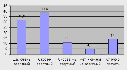 Рис. 1. Распределение ответов на вопрос: "Скажите, пожалуйста, Вы азартный человек или нет?" В процессе исследования были составлены портреты игроков, "обеспечивающих кассу" устроителям азартных игр: профессиональные игроки, интеллектуальные игроки, спонтанные игроки, "завязавшие" и "статусные" игроки. 1) Профессиональные игроки — те, для кого игра стала основной "профессией". Проигрыш для них является "текущими расходами" и вложением в будущий выигрыш, а выигрыш — фактически основным и единственным средством к существованию. Их стратегия: играть достаточно долго и по "определённой методе", чтобы "сорвать банк" и выйти из игры с выигрышем. Стратегия основывается на точном, с их точки зрения, научном (математическом) расчёте и на глубоком знании психологии людей. Для них характерен строго рациональный подход. Их тактика: имея минимальные риски на проигрыш и, по‑возможности, имея максимальные шансы на выигрыш, играть достаточно долго для того, чтобы в момент выигрыша оказаться "в нужном месте в нужное время". Можно описать их тактику как тактику волка‑охотника, отслеживающего, не отбилась ли какая овца от стада. Их движущий мотив: получить выгоду, заработать на жизнь. 2) Интеллектуальные игроки — те, для кого игра не более чем дорогое, но всё же развлечение, тешащее самолюбие. Можно выделить два типа интеллектуальных игроков. К первому типу относятся реализовавшие себя в социальном плане бизнесмены, с развитой саморегуляцией, которые способны позволить себе эксклюзивное — а потому дорогое — развлечение "играть на риске в чистом его виде". Проигрыш для них является лишь эмоциональной встряской интеллекта ("щекоткой нервов", которую в жизни и от работы они в таком остром и свежем состоянии уже не получают), а выигрыш — абстрактной целью, приносящей сугубо моральное удовлетворение, поскольку он сумел победить в заведомо проигрышных условиях: "Когда иногда хочется себя подогреть, когда ты действительно всерьез начинаешь включать в себе интуицию, то материальное подкрепление это активизирует". Их стратегия: положиться на случай и, выиграв, доказать себе, что ты не просто незаслуженный "везунчик" по жизни, а "заслужил" те блага, что имеешь. Такое отношение хорошо сочетается с протестантской этикой, подразумевающей, что успешность в мирских делах — это показатель избранности богом. Эта концепция доминирует в умах бизнесменов. Их тактика: игра "на равных", противопоставление слепому случаю (на стороне которого математическая вероятность избыточного риска) силы собственного профессионального интеллекта. Их мотив: получить удовлетворение от решения сверхзадачи (которая, в принципе, не под силу человеческому уму, но считается ими решённой в случае существенного выигрыша). Ко второму типу относятся образованные, но не добившиеся признания в социальном плане люди. Для них также игра выступает как возможность доказать себе, что "он может чего-то достичь в жизни", выигрыш выступает так же, как и в первой группе, прямым подтверждением высокого интеллектуального потенциала человека, но, временно, не способного доказать, что "для него есть тоже место под солнцем"; 3) Спонтанные игроки — те, для кого игра стала образом жизни. Такие игроки не осознают своей зависимости от игры, хотя реально она их всецело захватывает и "ведёт" по жизни. Таких игроков пс