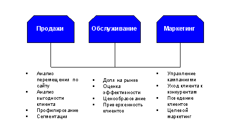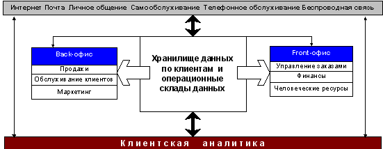 Рис. 1. Интегрированная CRM архитектура В дальнейшем, по мере сбора информации об опыте работы с клиентами, компания должна разработать такой процесс, при котором непрерывно измеряется и проверяется эффективность аналитических моделей. Таким образом, обновления клиентской аналитики выполняются с использованием данных о последних операциях с клиентами. Этот последний шаг часто игнорируют, хотя он особенно важен, так как гарантирует, что аналитические модели отражают текущую практическую информацию о быстро изменяющемся состоянии бизнеса. Ключевым фактором в достижении этой цели является наличие четкой ориентации на обслуживание клиента, которая подкрепляется CRM-системой, интегрированной с клиентской аналитикой. Хранилище данных по клиентам Наиболее эффективный способ создания интегрированной CRM-среды состоит в реализации Хранилища данных по клиентам (Customer Data Warehouse, CDW. В таком Хранилище собираются данные из всех источников для создания единого интегрированного представления о каждом клиенте. В результате, в клиентском Хранилище накапливается необходимая для анализа информация. Только с помощью аналитических средств действительно можно добиться правильного предложения продуктов и услуг по нужным каналам нужным клиентам в нужный момент времени и по приемлемой цене. Важно заметить, что клиентское Хранилище должно содержать не просто информацию о заказчике. Например, в последние два года основными параметрами CRM становятся не показатели продаж (т.е. объем сделок связанный с привлечением, сохранением клиентов, перекрестными продажами и т.п.), а чистая выручка (а выгодный ли это клиент?). Объединяя информацию о клиенте с финансовыми данными, многие компании используют интегрированные CRM-решения для расчета выгодности клиента и прогнозирования показателя lifetime value[1] .Так, выполняя такой анализ, одна из авиационных компаний с удивлением обнаружила, что всего лишь 16 процентов клиентов обеспечивают 85% дохода. Такой факт невозможно было выявить, всего лишь изучив информацию о количестве клиентов, которая хранится в системе, просто регистрирующей участников полетов и расстояния, на которые они летали. Технология Хранилищ данных является ключевым фактором, обеспечивающим интеграцию CRM-систем и аналитических средств. По существу, компаниям, планирующим реализацию интегрированных CRM-стратегий для достижения своих целей, потребуются навыки и знания, касающиеся ХД. Клиентская аналитика: "Секретный соус" CRM Совершенно не достаточно всего лишь собрать клиентскую информацию из различных каналов (хотя это и важный первый этап). Важнее проанализировать эти сведения таким образом, чтобы проникнуть в суть поведения клиентов. Аналитические средства должны использовать данные о действиях клиентов в прошлом, тенденции, а также психографические и демографические параметры для того, чтобы: поддерживать и развивать более эффективное обслуживание и взаимодействие с клиентами; прогнозировать, какие продукты, услуги, каналы, цены и т.п. вызовут наибольший интерес в будущем. В компании PricewaterhouseCoopers под клиентской аналитикой понимается применение передовых аналитических методов для обработки информации о заказчиках с целью выявления, привлечения и сохранения наиболее выгодных из них. Это понятие объединяет в себе и людей, и процессы, и