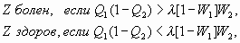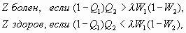 где λ = P(V2)/P(V1) – отношение априорных вероятностей здоровых и больных пациентов. В ситуации же S21, когда A1 признал Z здоровым, а A2 – больным, окончательный диагноз следует ставить согласно схеме: