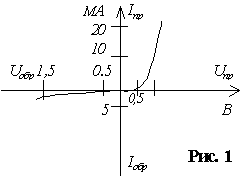 В технике сверхвысоких частот (для работы в сантиметровом и миллиметровом диапазонах волн) применяются особые германиевые и кремневые сверхвысокочастотные диоды (СВЧ диоды). По своему назначению СВЧ диоды делятся на видео детекторные, предназна-чены для детектирования СВЧ колебаний, переключательные, пред-назначенные для применения в устройствах управления уровнем СВЧ мощности, параметрические, предназначенные для примене-ния в параметрических усилителях СВЧ колебаний, и преобразова-тельные. В свою очередь, преобразовательные диоды, в которых ис-пользуется нелинейность вольтамперной характеристики перехода, делят на смесительные, используемые для преобразования СВЧ сигнала и сигнала гетеродина в сигнал промежуточной частоты, ум-ножительные, используемые для умножения частоты СВЧ сигнала, и модуляторные, используемые для модулирования амплитуды СВЧ сигнала. В СВЧ диодах обычно используется точечный контакт. Переход в таких диодах не формуется. Выпрямляющий контакт осуществля-ется простым прижимом к полированной поверхности полупровод-ника острия металлического контактной пружины. Эти диоды изго-товляются из очень низкоомного материала (время жизни носителей заряда мало) и имеют весьма малый радиус точечного контакта (2-3 мкм), что обеспечивает хорошие высокочастотные свойства. Однако напряжение пробоя СВЧ диодов очень низкое (всего 3-5 В), а пря-мое напряжение относительно высокое. Обратный ток у них хотя и мал, но начинает возрастать практически с нуля за счет туннельного эффекта носителей через переход (рис.1).