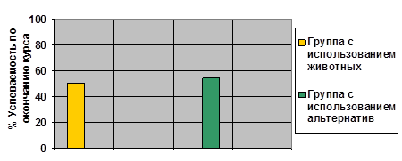 Цены на период 1993г. 1 - время персонала (лекторы: £40/час лаборанты: £10/час) - время техника (£10/час) - материалы - общая стоимость. 5. Замена опытов на животных альтернативными методами в итоге дает такие же или даже лучшие результаты в конце курса (см. диаграмму ниже) [30].